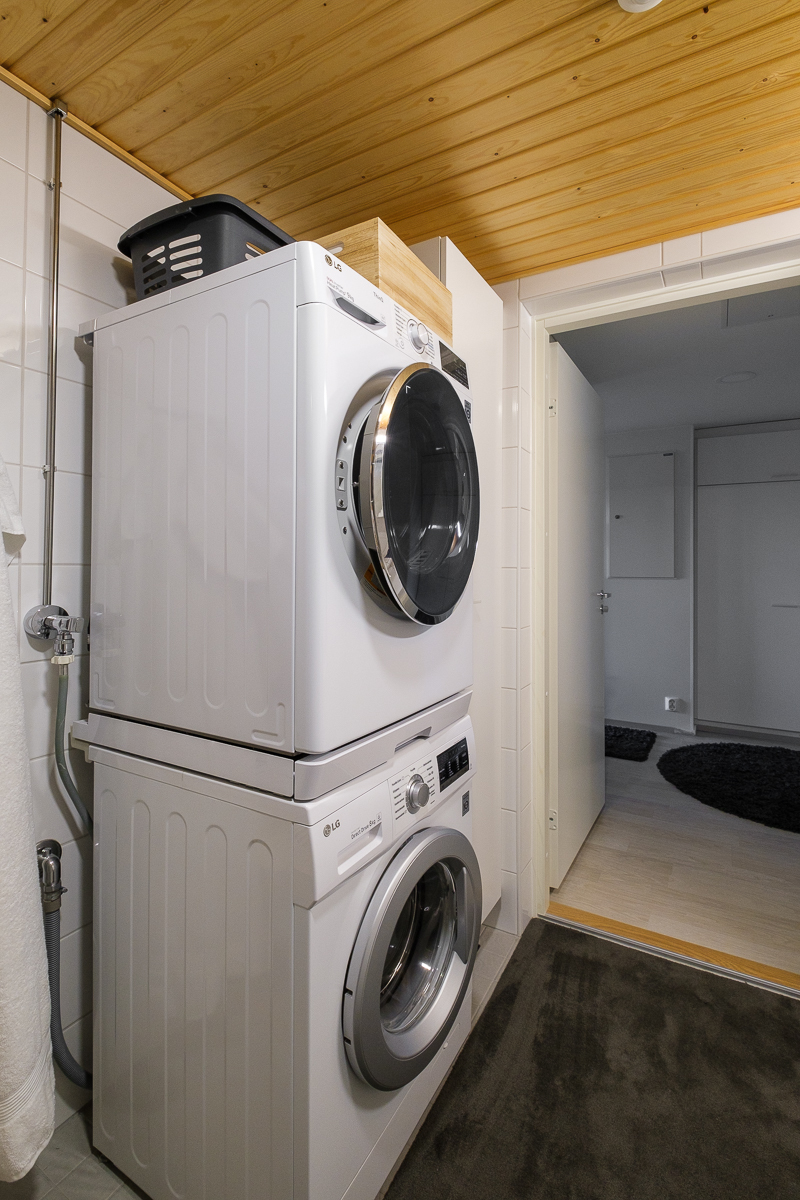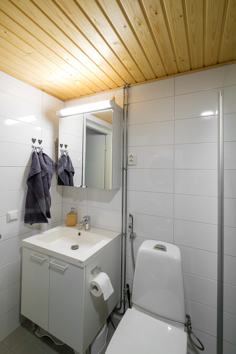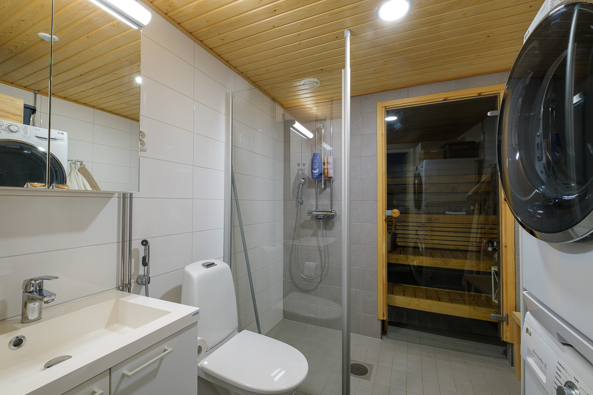 Pesukoneliitäntä, suihkuseinä, wc-istuin, lattialämmitys, peilikaappi, suihku ja kiinteät valaisimet, seinät (kaakeli), lattiat (laatta) |