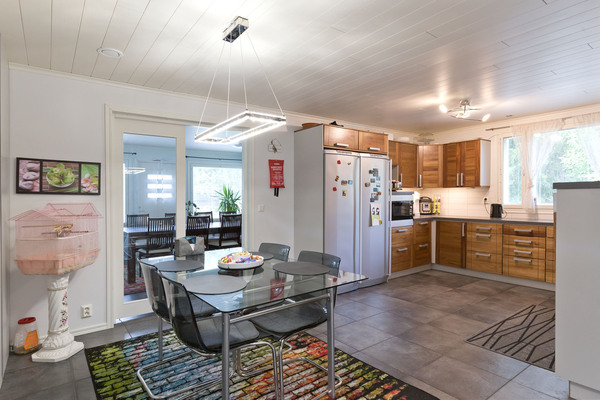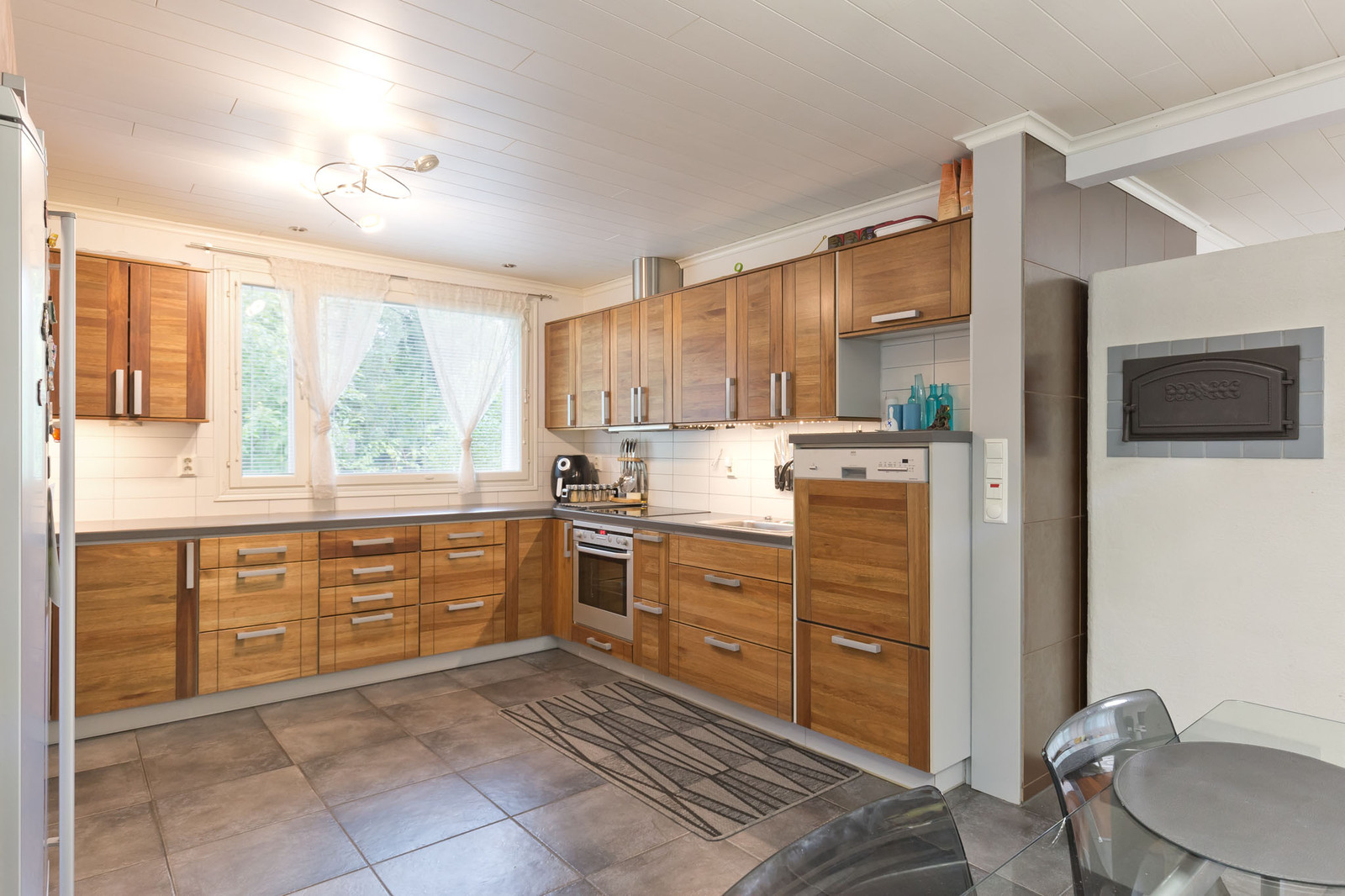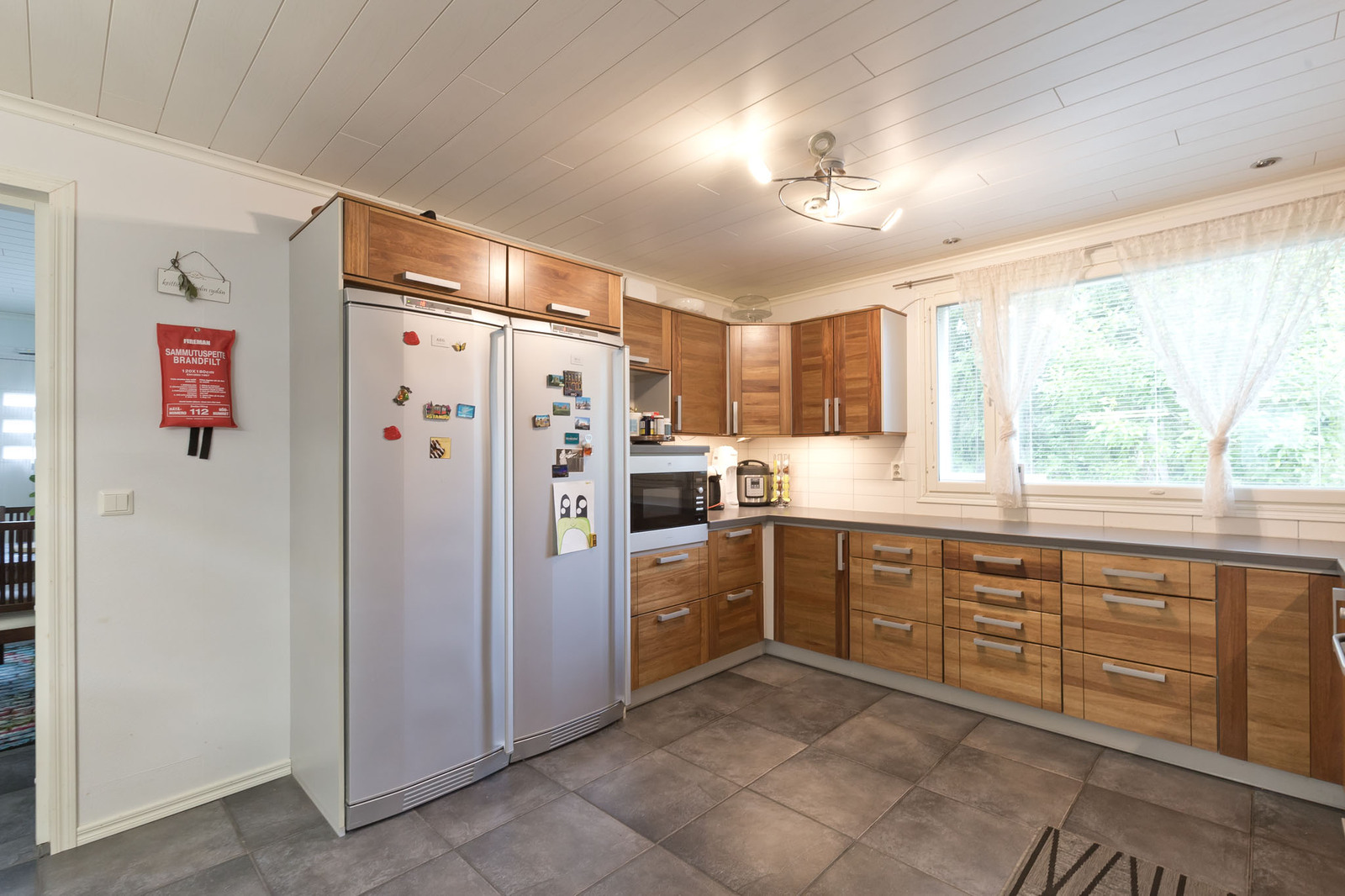 | Keittiön kuvaus | Liesi (Keraaminen liesi ja erillisuuni, liesitaso, leivinuuni), työtasot (laminaatti), seinät (osalaatoitus), lattiat (laatta), liesituuletin, jääkaappi, erillisuuni, uuni, astianpesukone, mikroaaltouuni ja pakastekaappi, liesitaso, kiinteät valaisimet |