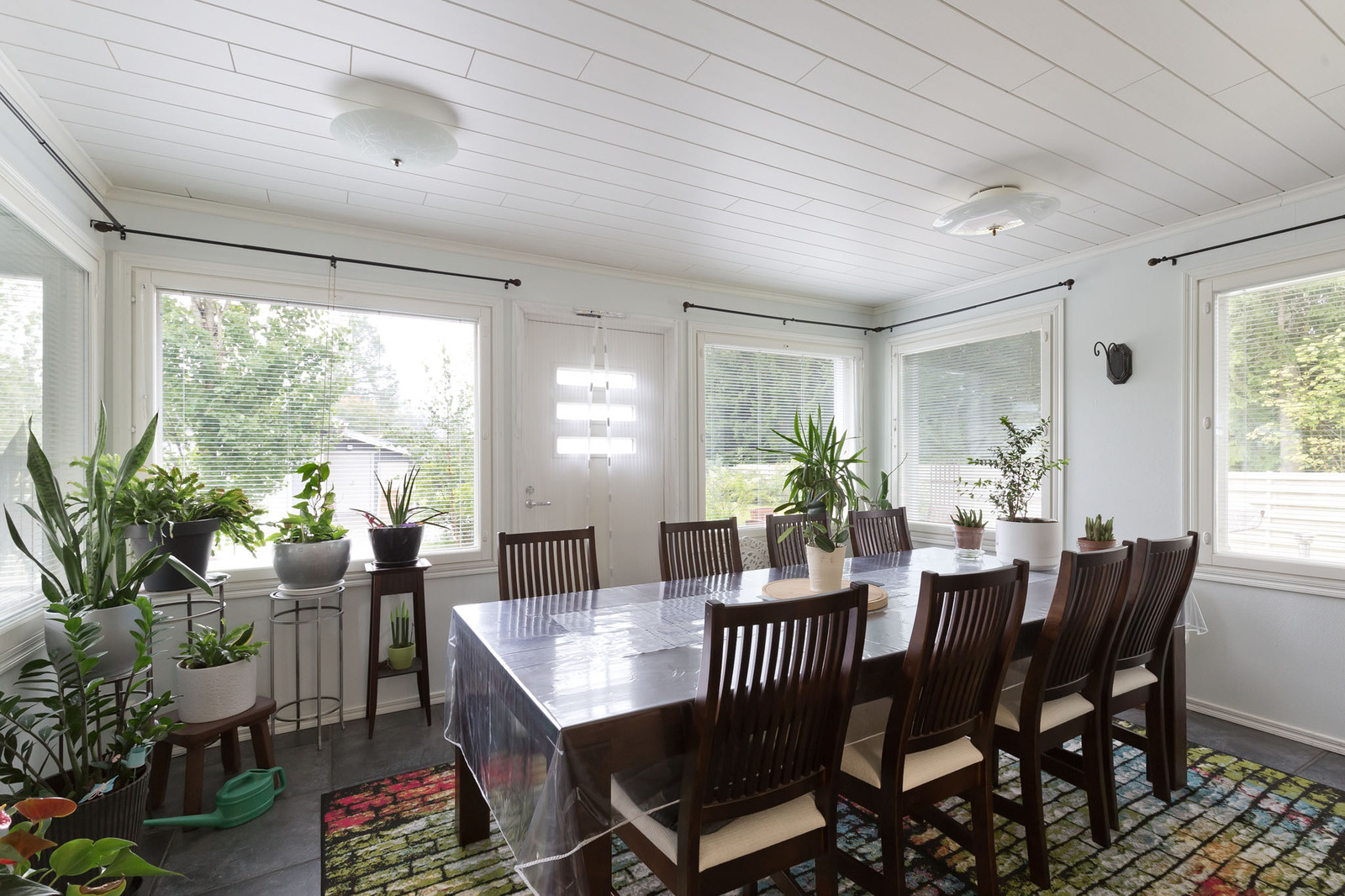 | Muuta kauppaan kuuluvaa | Lisätietoja sisältyvistä varusteista: hälytys- /valvontajärjestelmä, istutukset, kaapistot, keskuspölynimuri, kiinteät valaisimet, kuivauskaappi/-rumpu, matontamppausteline, pyykinpesukone, satelliittiantenni, sälekaihtimet/rullaverhot, verhotangot |