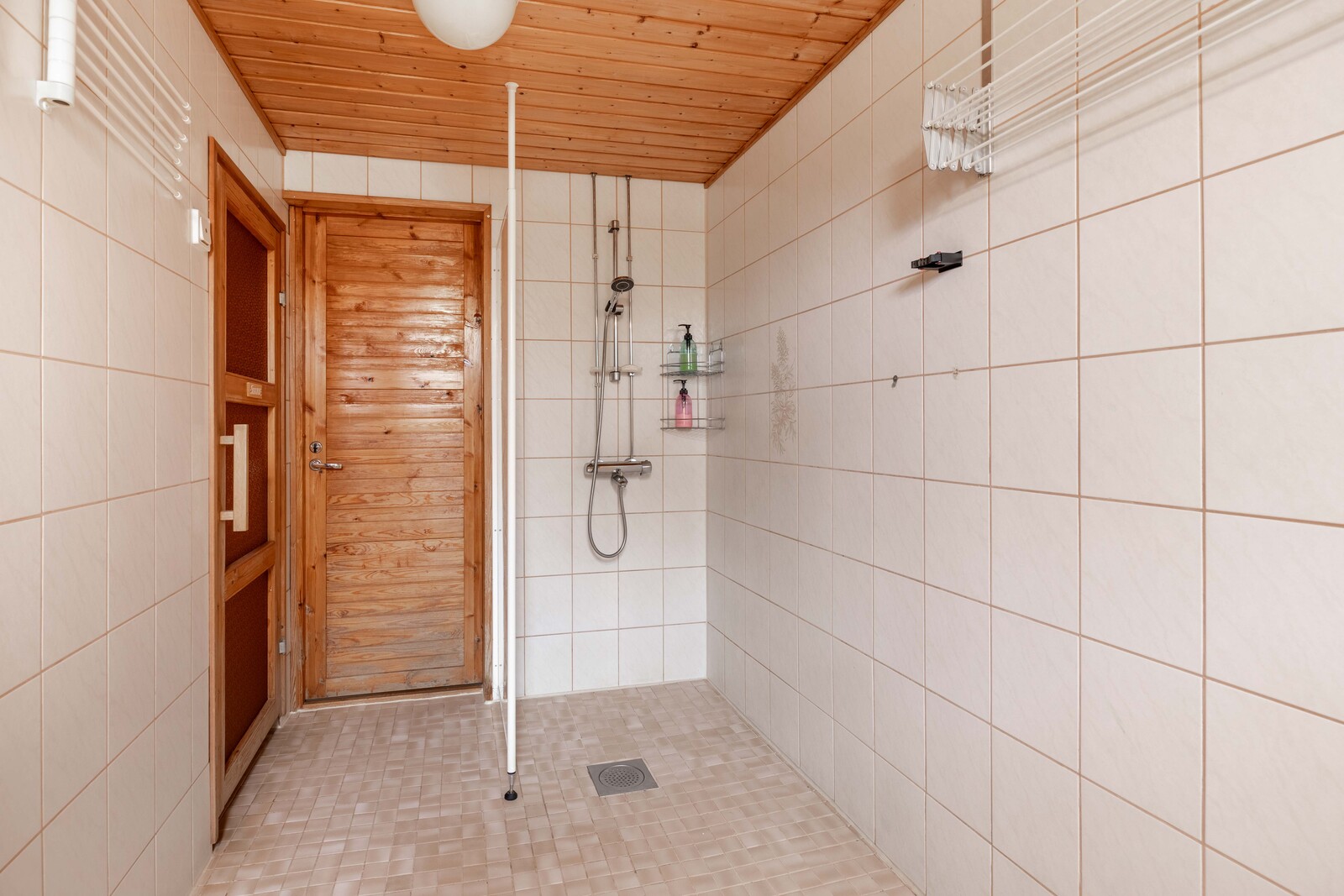 | Saunan kuvaus | Seinät (puu), lattiat (laatta), Sähkökiuas |