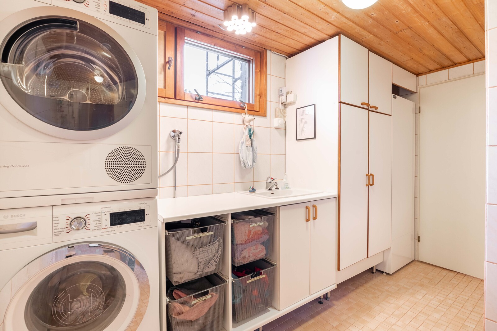 | Kodinhoitohuoneen kuvaus | Lattialämmitys, lastenhoitopöytä/taso, pesukoneliitäntä, lattiakaivo, pyykkikaapit ja pesuallas, lattiat (laatta), seinät (kaakeli), tila pesutornille |
