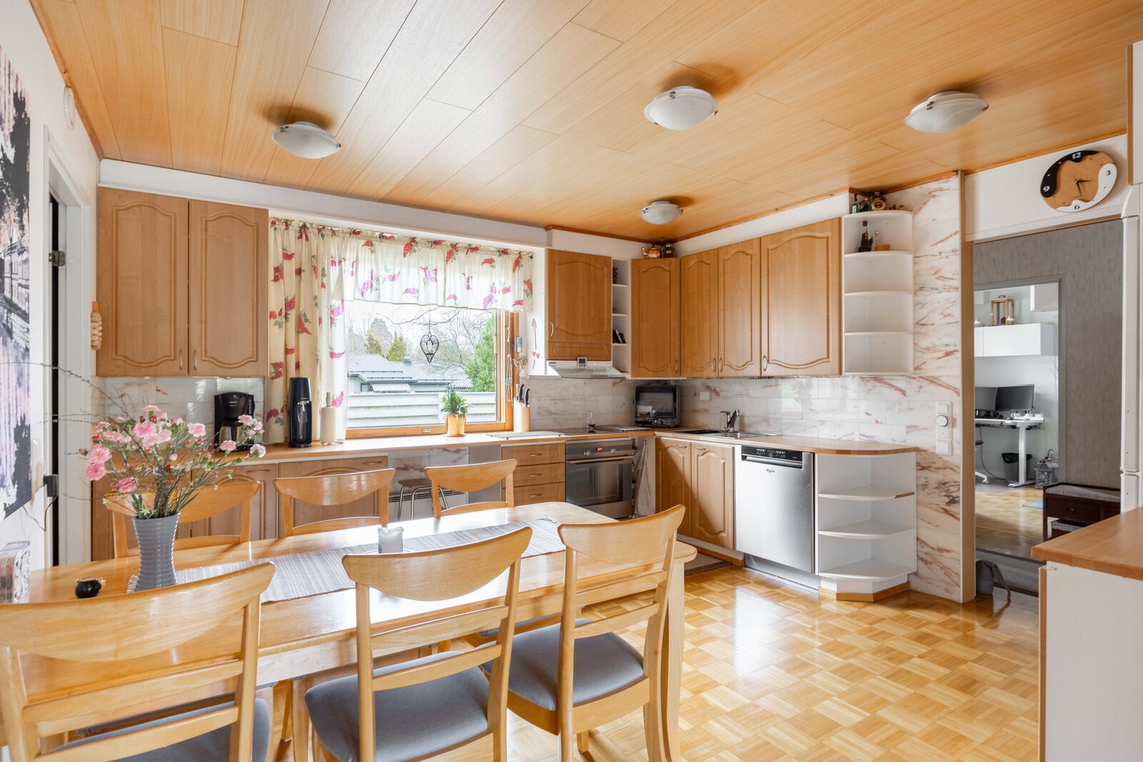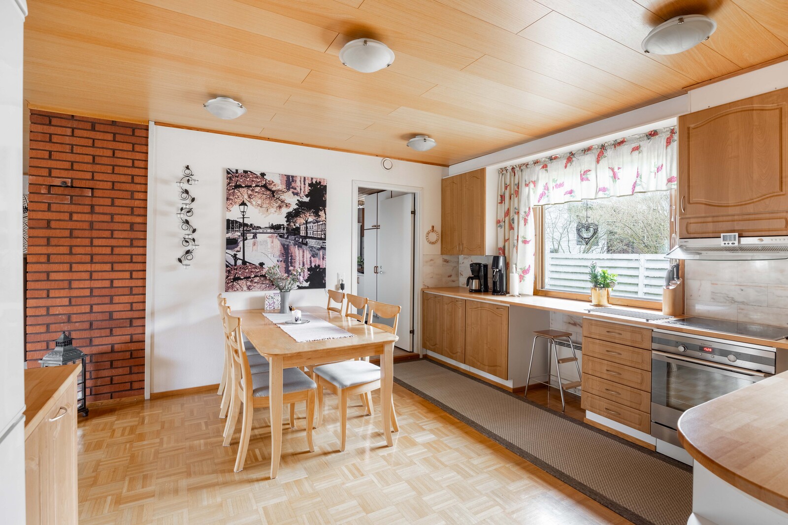 | Keittiön kuvaus | Liesi (Induktioliesi ja erillisuuni), työtasot (laminaatti), seinät (maali), lattiat (parketti), erillisuuni, erillinen pakastin, astianpesukone, jääkaappi, liesi ja liesituuletin / hormi, kiinteät valaisimet |