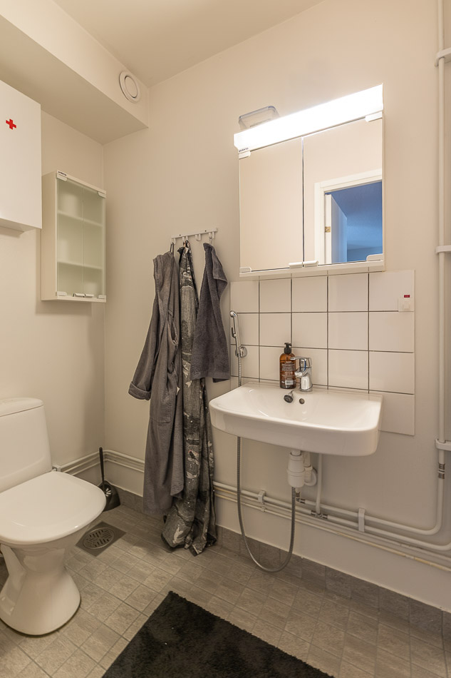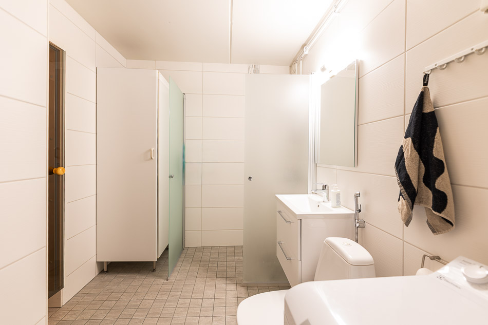 | Kylpyhuoneen kuvaus | WC-istuin, suihku, suihkuseinä, pesukoneliitäntä, peili, pesuallas, allaskaappi ja bidee-suihku, seinät (kaakeli), lattiat (laatta) |