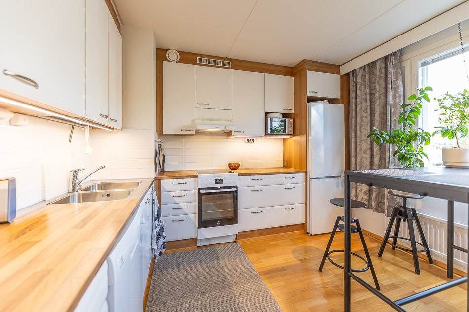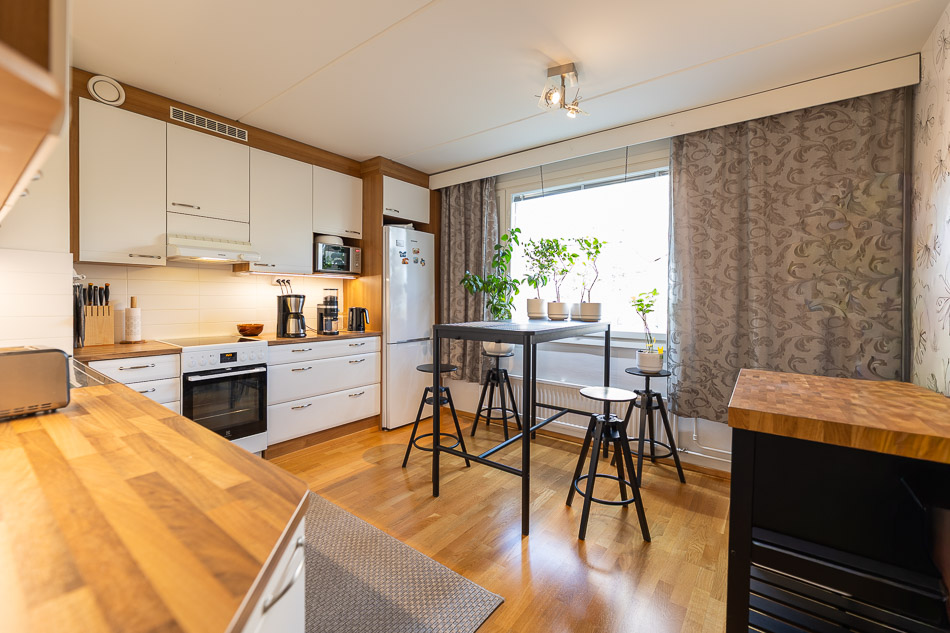 | Keittiön kuvaus | Liesi (Induktioliesi), työtasot (laminaatti), seinät (laatta, maali ja tapetti), lattiat (parketti), jääkaappipakastin (Samsung), uuni (Electrolux), liesituuletin (Siemens), liesi (Electrolux) ja astianpesukone (Electrolux) |