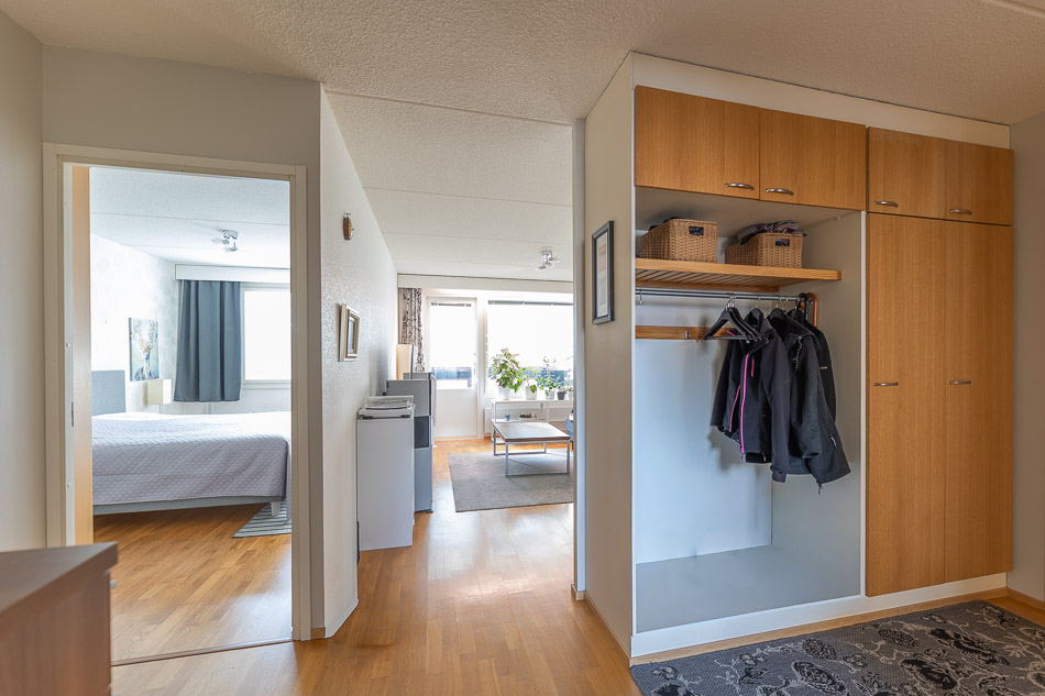 | Muut huoneet ja tilat | Tilava vaatehuone, jossa hyllyt ja vaatetanko. Lattiassa muovimatto. Seinät on maalattu. |