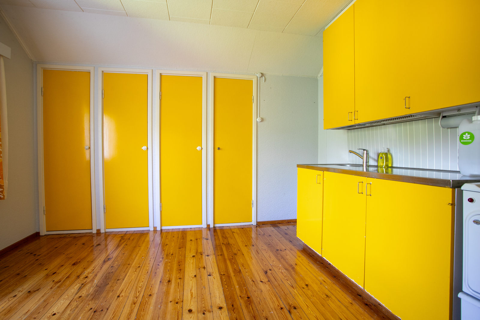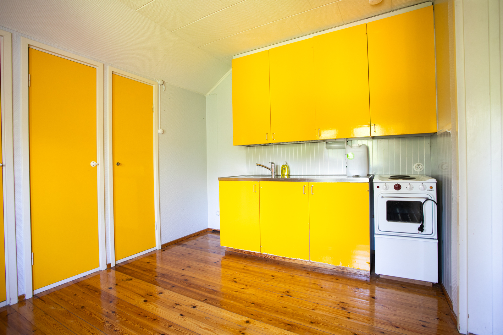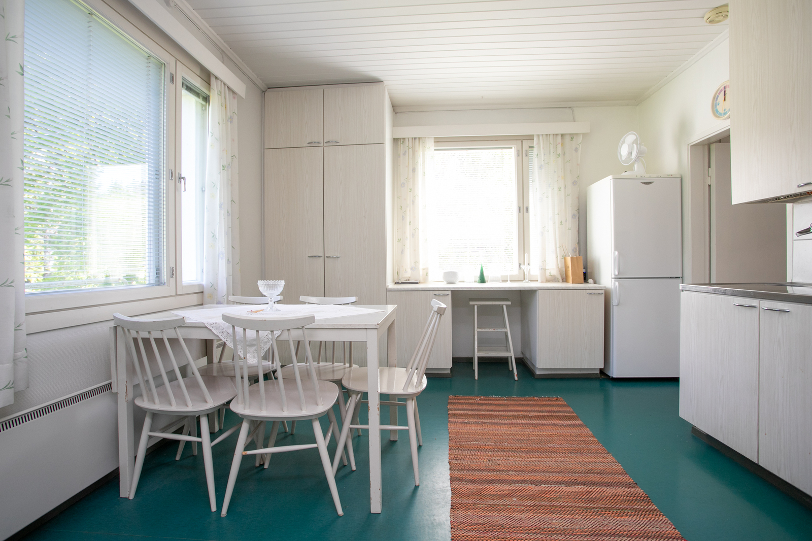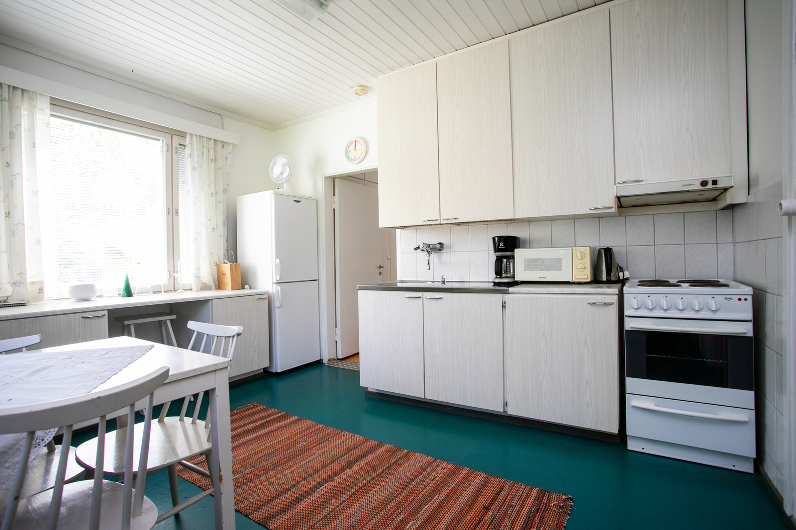 Liesi (sähköliesi), työtasot (laminaatti), seinät (maali), lattiat (muovimatto), mikroaaltouuni, erillinen pakastin, jääkaappi, liesi ja kiinteät valaisimet |