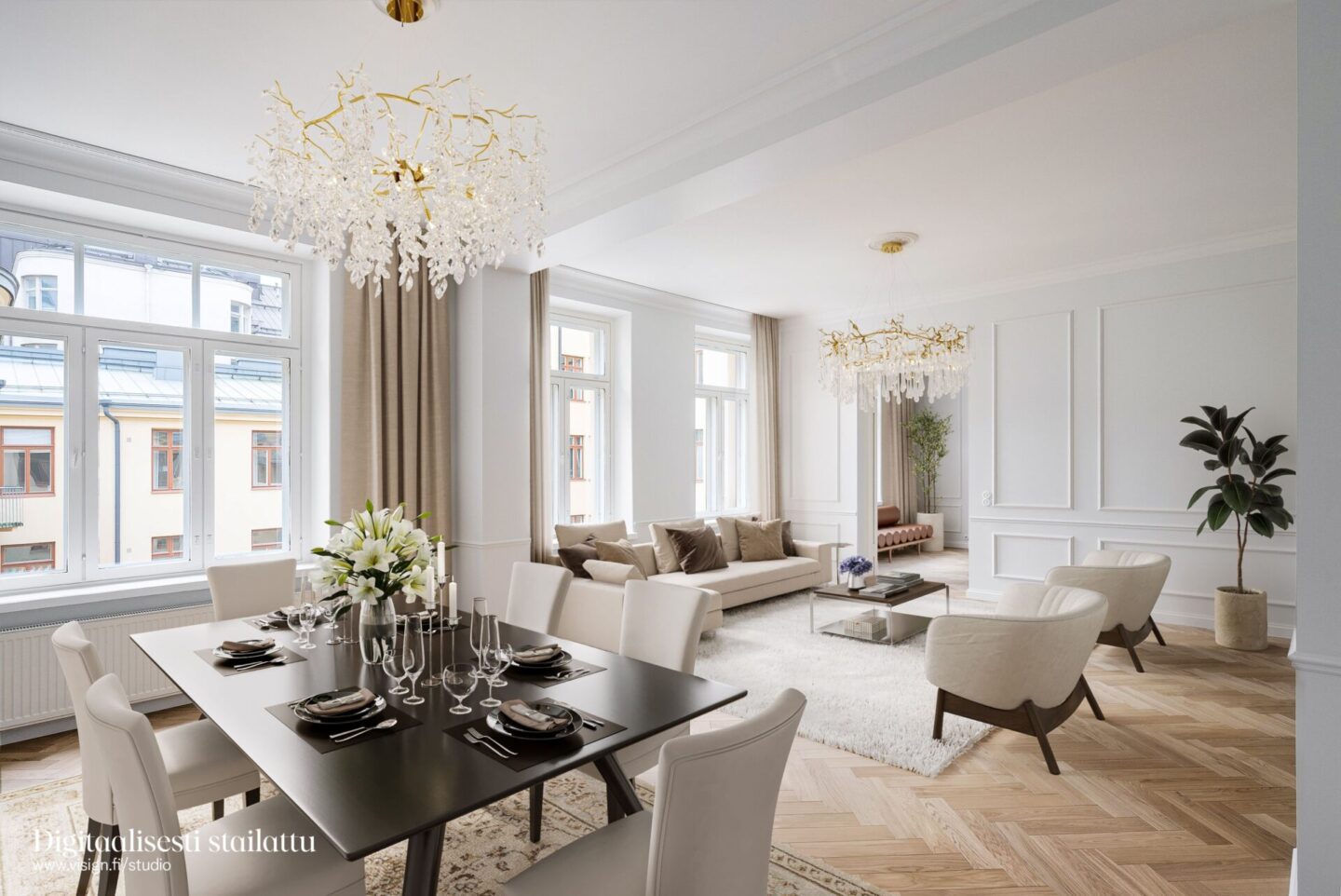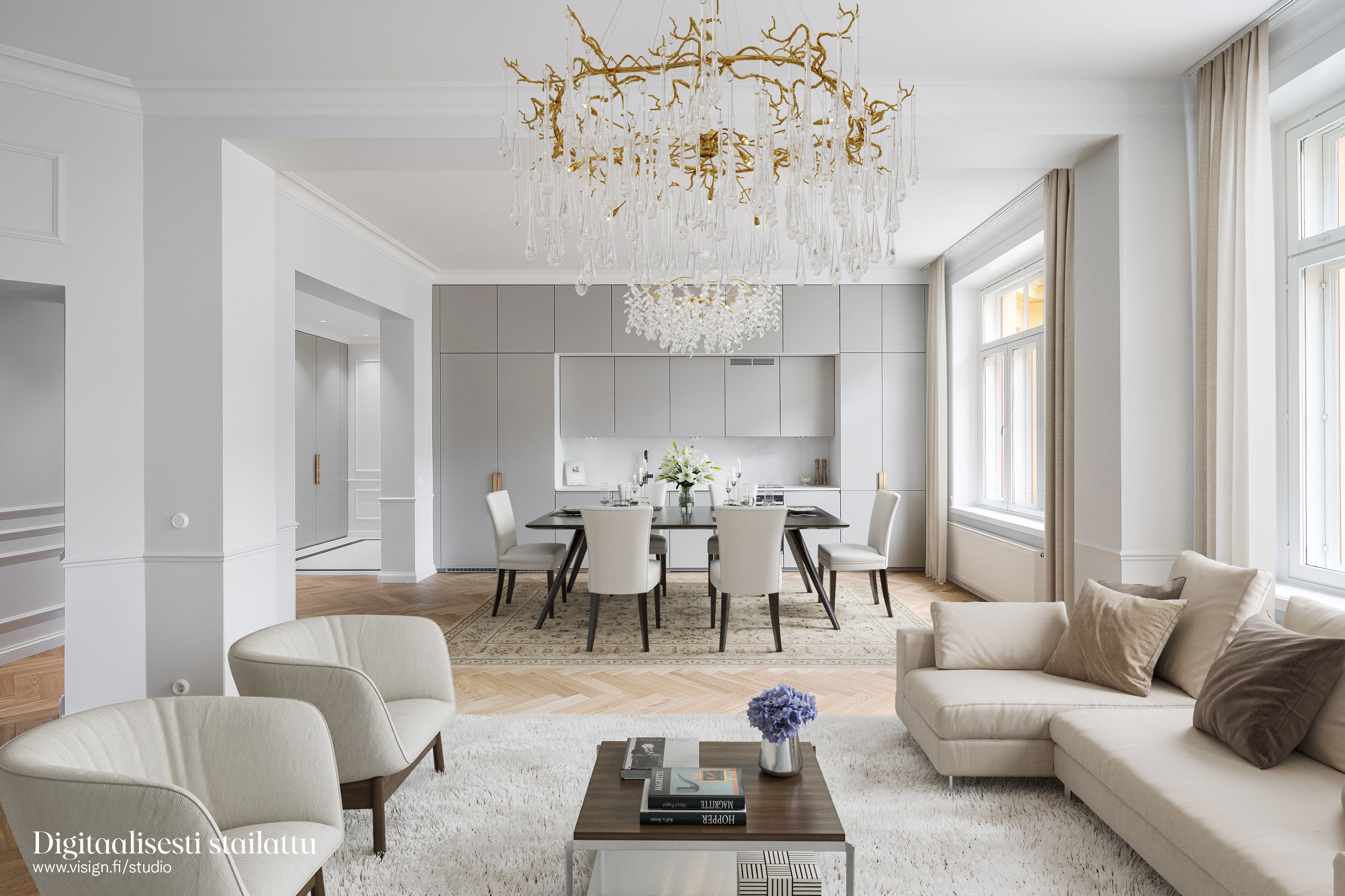 Pohjaratkaisu on avara, ja asunnon eri osat sulautuvat luontevasti toisiinsa muodostaen elegantin klassisen kokonaisuuden, joka sopii niin omaksi kodiksi kuin edustamiseen.