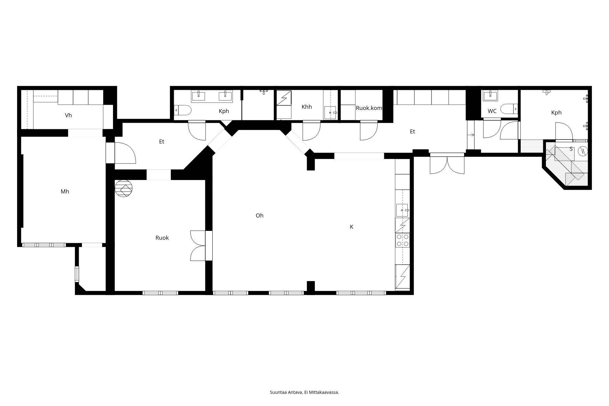 | Huoneistoselitelmä | Oh/k, ruokailuhuone, mh+vh, khh, 2 kph, s, wc |