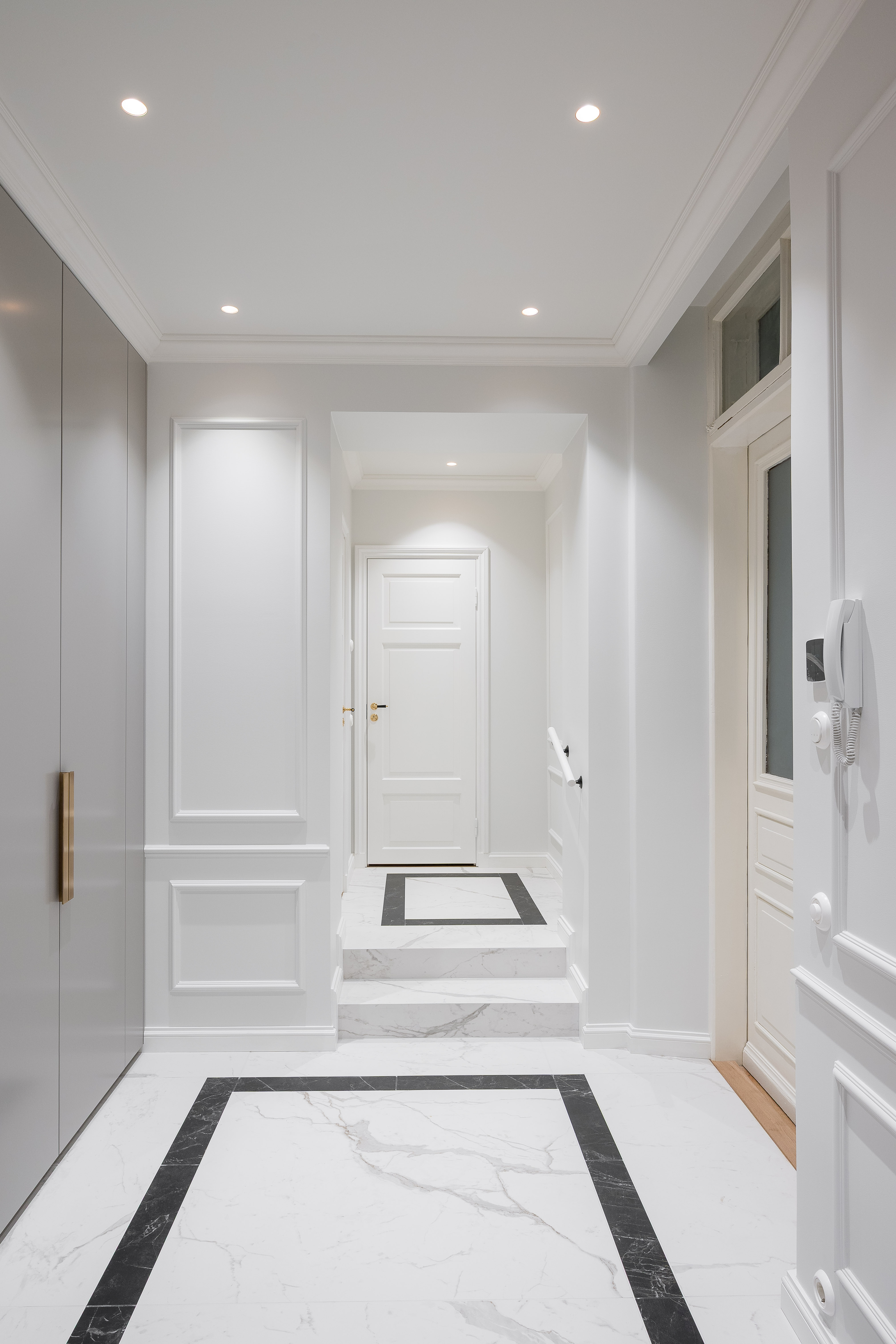 | Tilojen kuvaus | Huoneistossa on kaksi eteisaulaa, joista sisääntuloaulassa on runsaasti kaappitilaa. Sisääntuloaulan lattia on marmorikuvioista laattaa . Kodinhoitohuoneen vieressä on pieni huone, jossa on täyskorkea Siemens-viinikaappi sekä säilytystilaa esim. kuivatarvikkeille. |