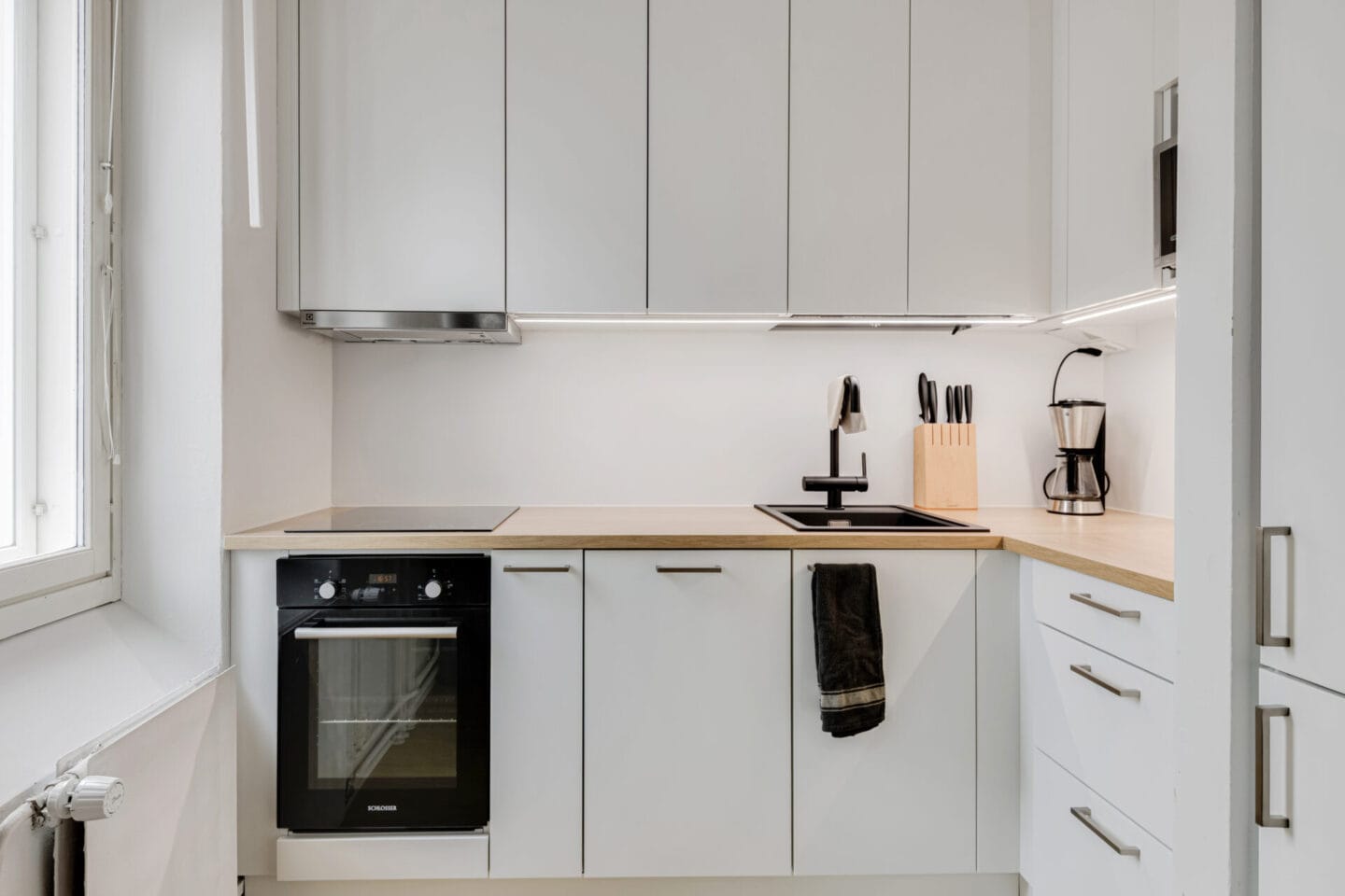 Kaunis keittiö on varustettu nykyaikaisesti ja kylpyhuoneessa on oma pesukoneliitäntä.