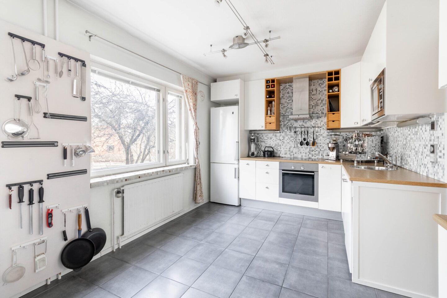 | Keittiön kuvaus | Liesi (erillisuuni, liesitaso), työtasot (laminaatti), seinät (maali), lattiat (laatta), erillisuuni, jääkaappipakastin, mikroaaltouuni, liesituuletin, astianpesukone ja liesitaso, irralliset kaapistot, myyjä ei vastaa kodinkoneiden toimivuudesta |