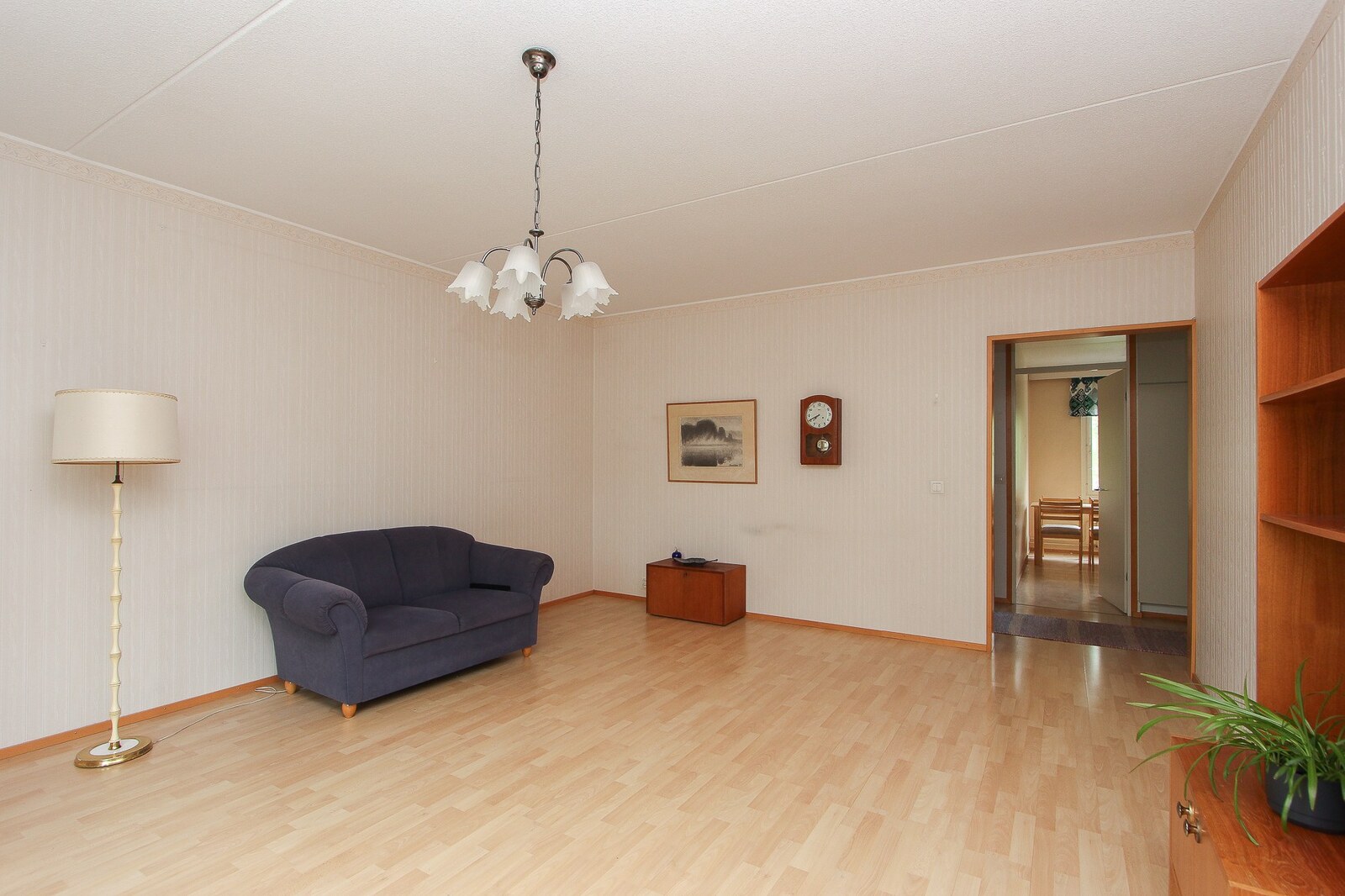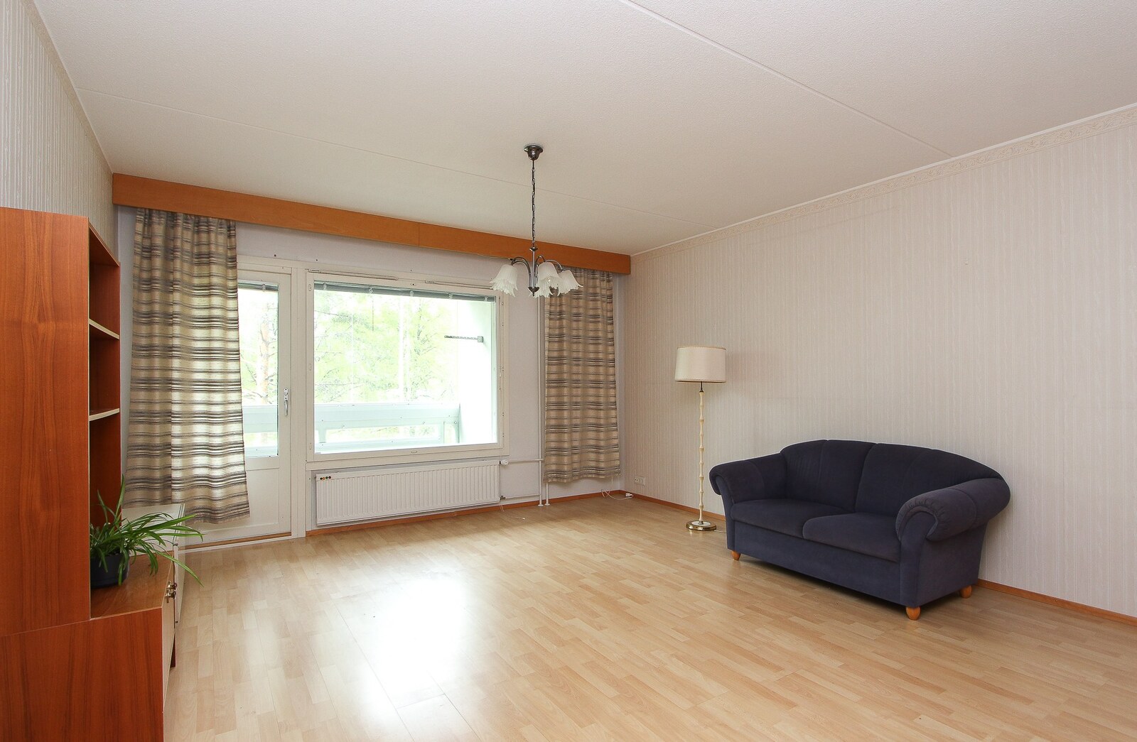 Olohuoneen kuvaus Seinät (tapetti), lattiat (laminaatti), Tilava olohuone, josta kulkuyhteys lasitetulle viihtyisälle parvekkeelle. Laminaatti lattian alla on muovimatto.