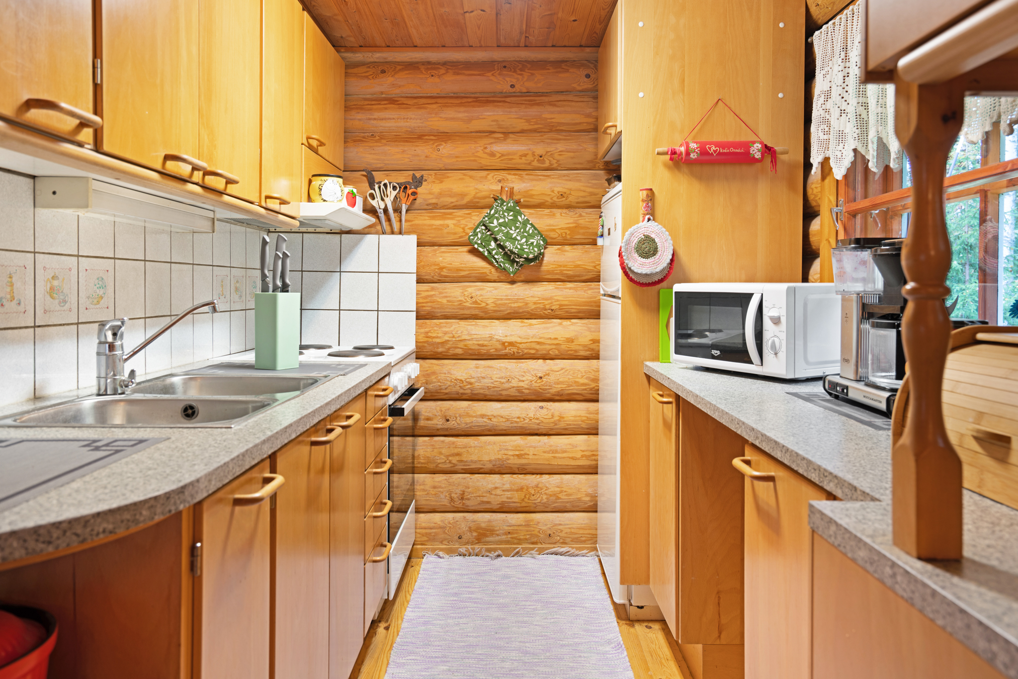 Liesi (Sähköhella), työtasot (laminaatti), seinät (hirsi), lattiat (lauta), jääkaappipakastin ja liesituuletin |
