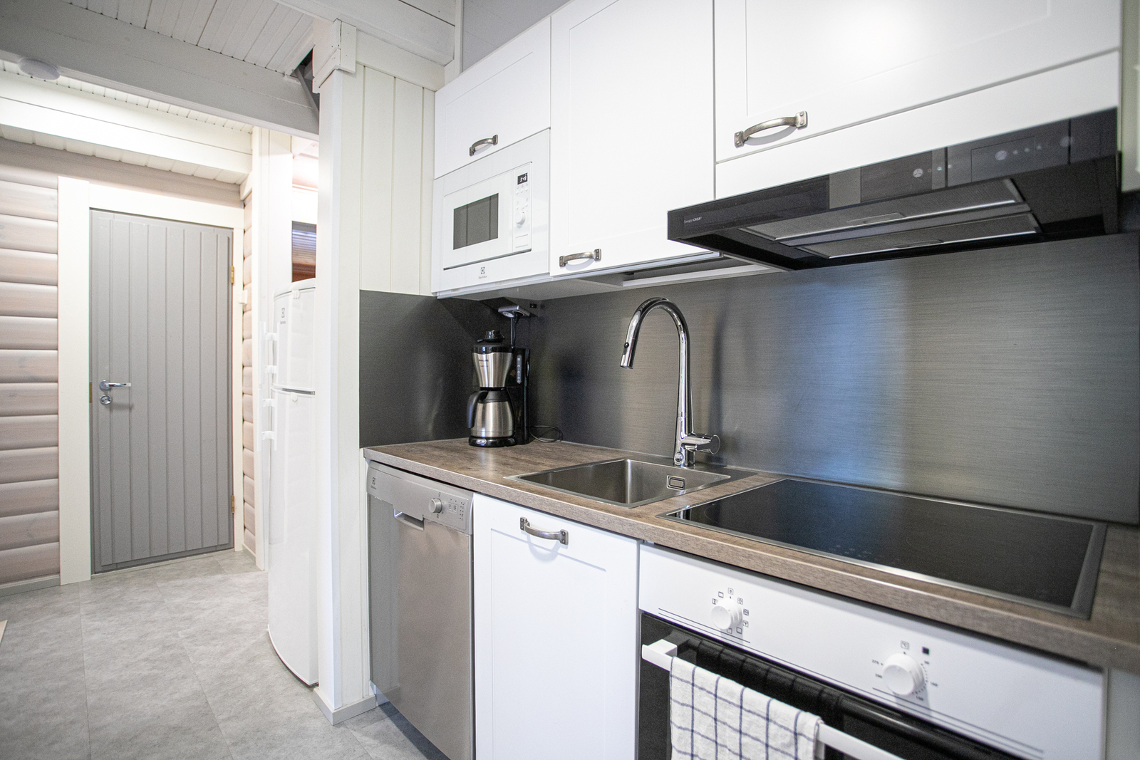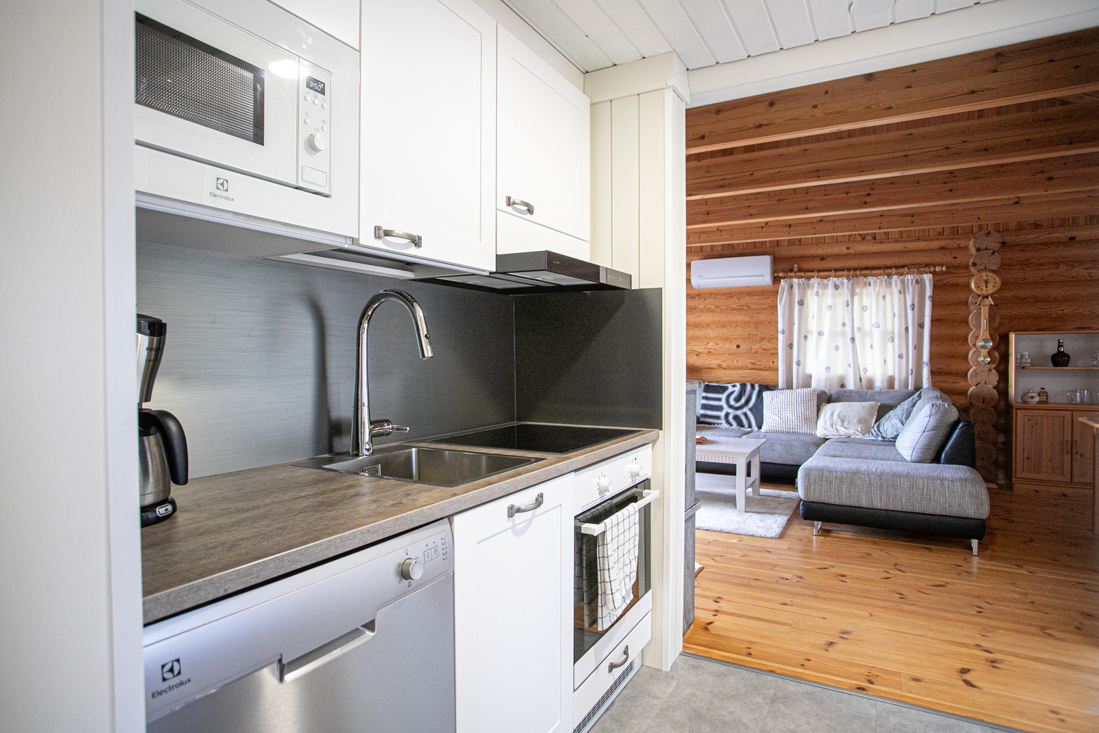 | Keittiön kuvaus | Liesi (erillisuuni, liesitaso), työtasot (laminaatti), seinät (puu), lattiat (laminaatti), astianpesukone, erillisuuni, jääkaappipakastin, mikroaaltouuni, liesituuletin ja kiinteät valaisimet, liesitaso |