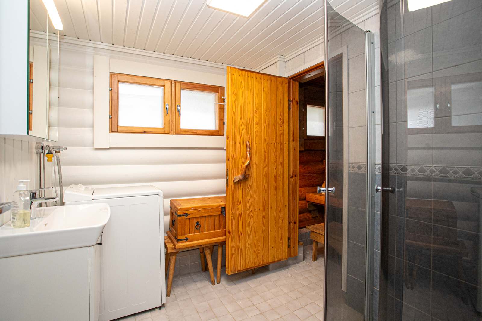 | Kylpyhuoneen kuvaus | Pesukoneliitäntä, suihkukaappi, lattialämmitys, suihkuseinä, pesukone, suihku ja kiinteät valaisimet, seinät (kaakeli), lattiat (laatta) |