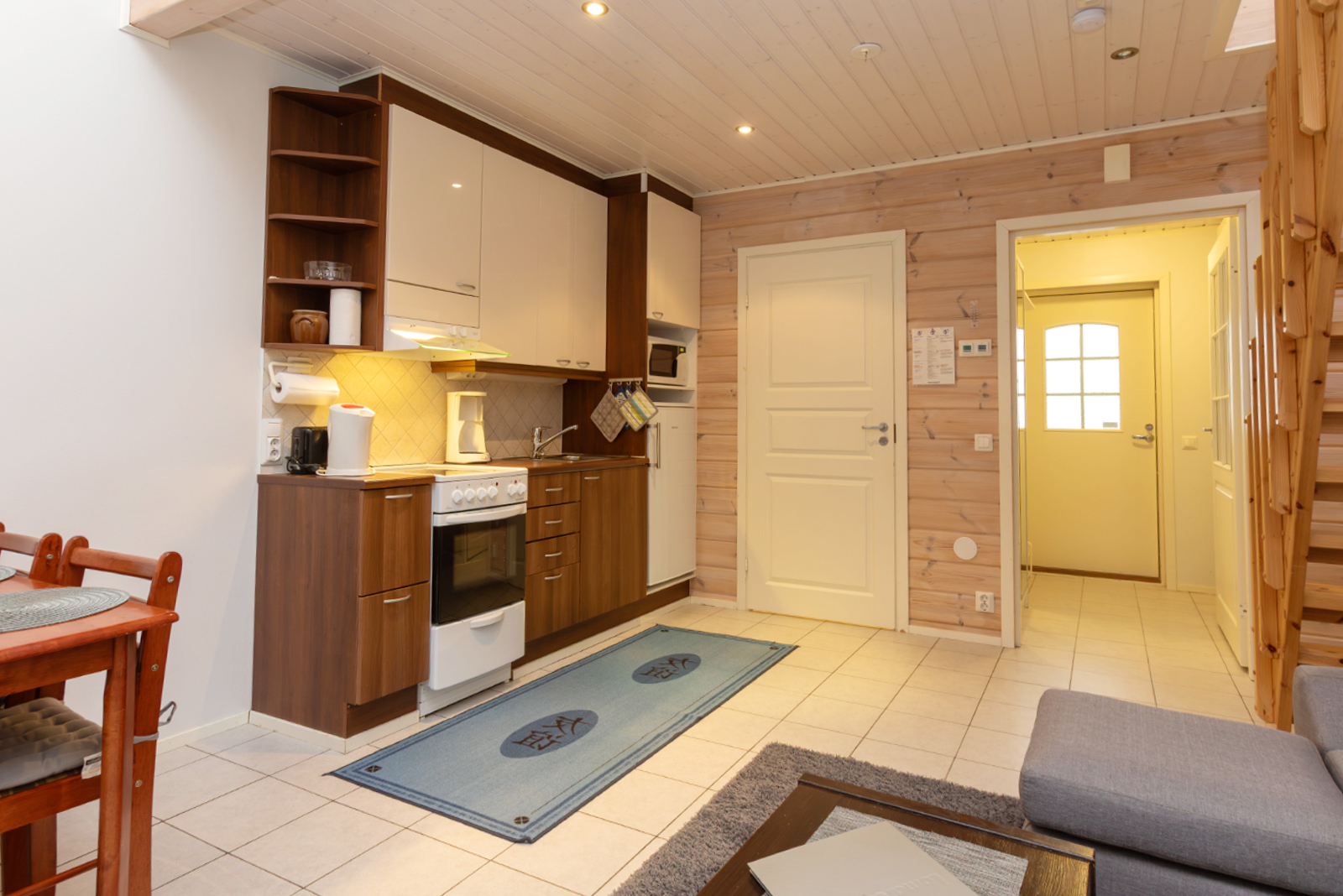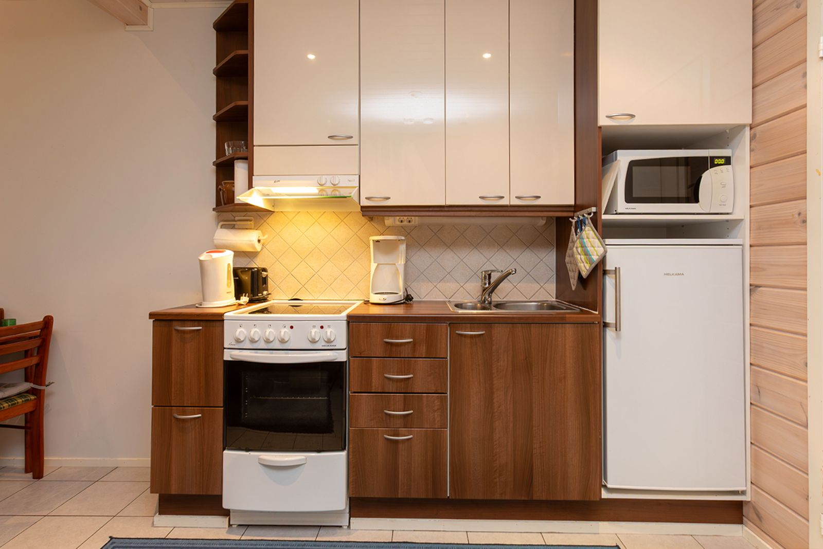 | Keittiön kuvaus | Liesi (sähköliesi), työtasot (laminaatti), seinät (maali), lattiat (laatta ja laminaatti), liesituuletin, jääkaappi, mikroaaltouuni, liesi ja kiinteät valaisimet |
