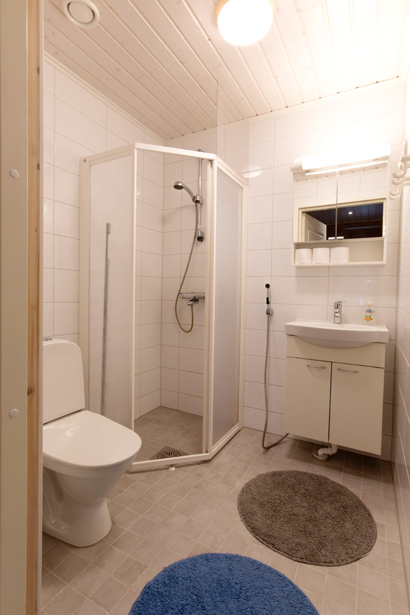 | Kylpyhuoneen kuvaus | Suihkuseinä, wc-istuin, suihku ja kiinteät valaisimet, seinät (kaakeli), lattiat (laatta) |