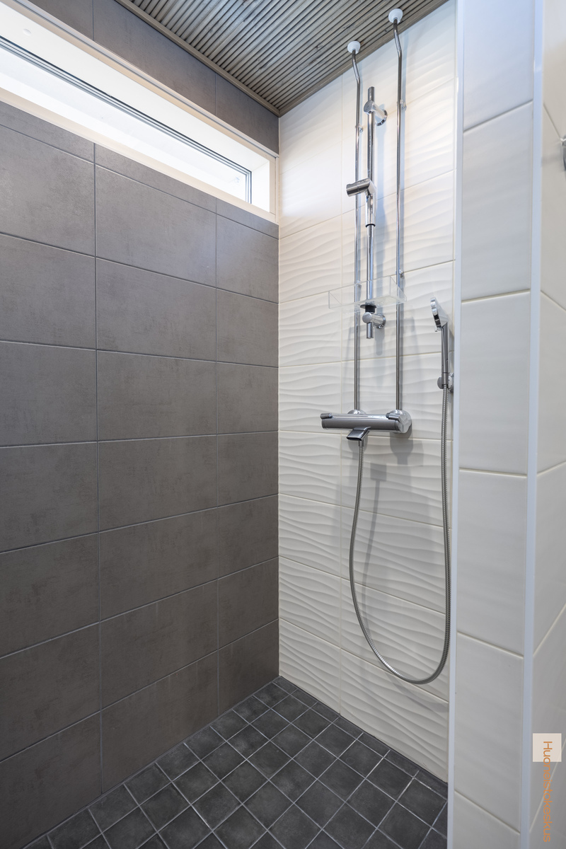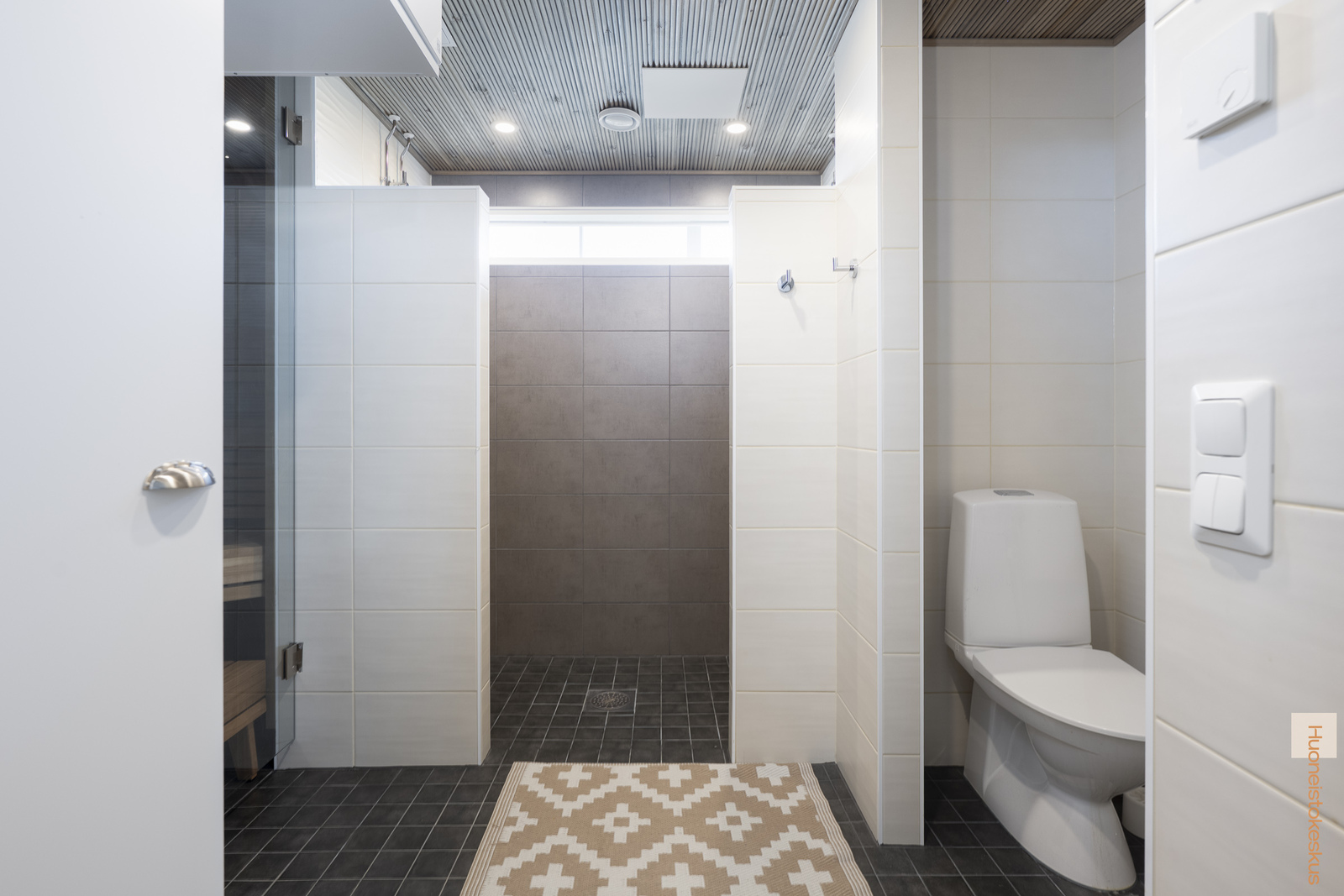 | Kylpyhuoneen kuvaus | Suihku, wc-istuin, lattialämmitys, pesukoneliitäntä, suihkuseinä ja kiinteät valaisimet, seinät (kaakeli), lattiat (laatta) |