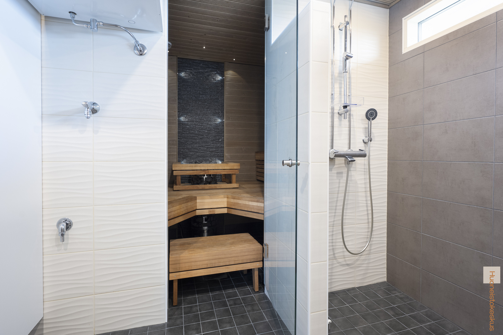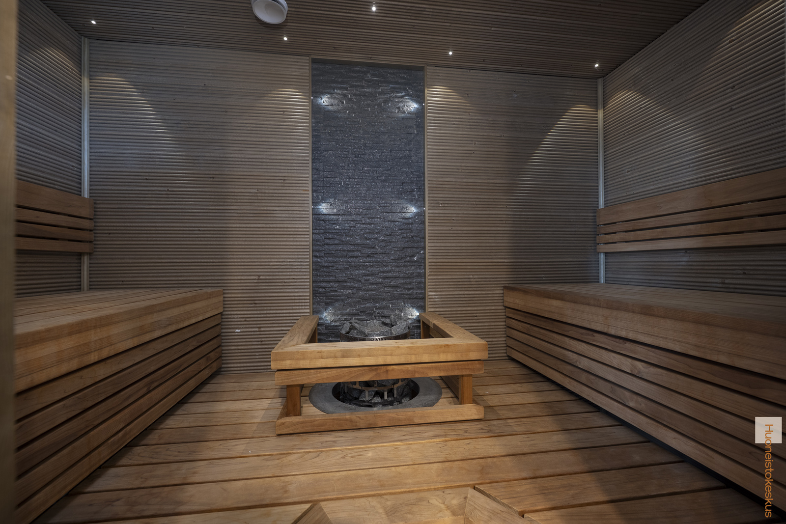 | Saunan kuvaus | Seinät (puu), lattiat (laatta), Sähkökiuas |