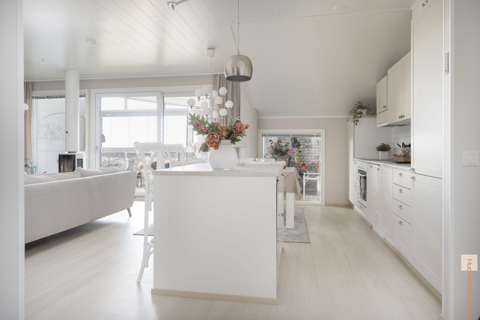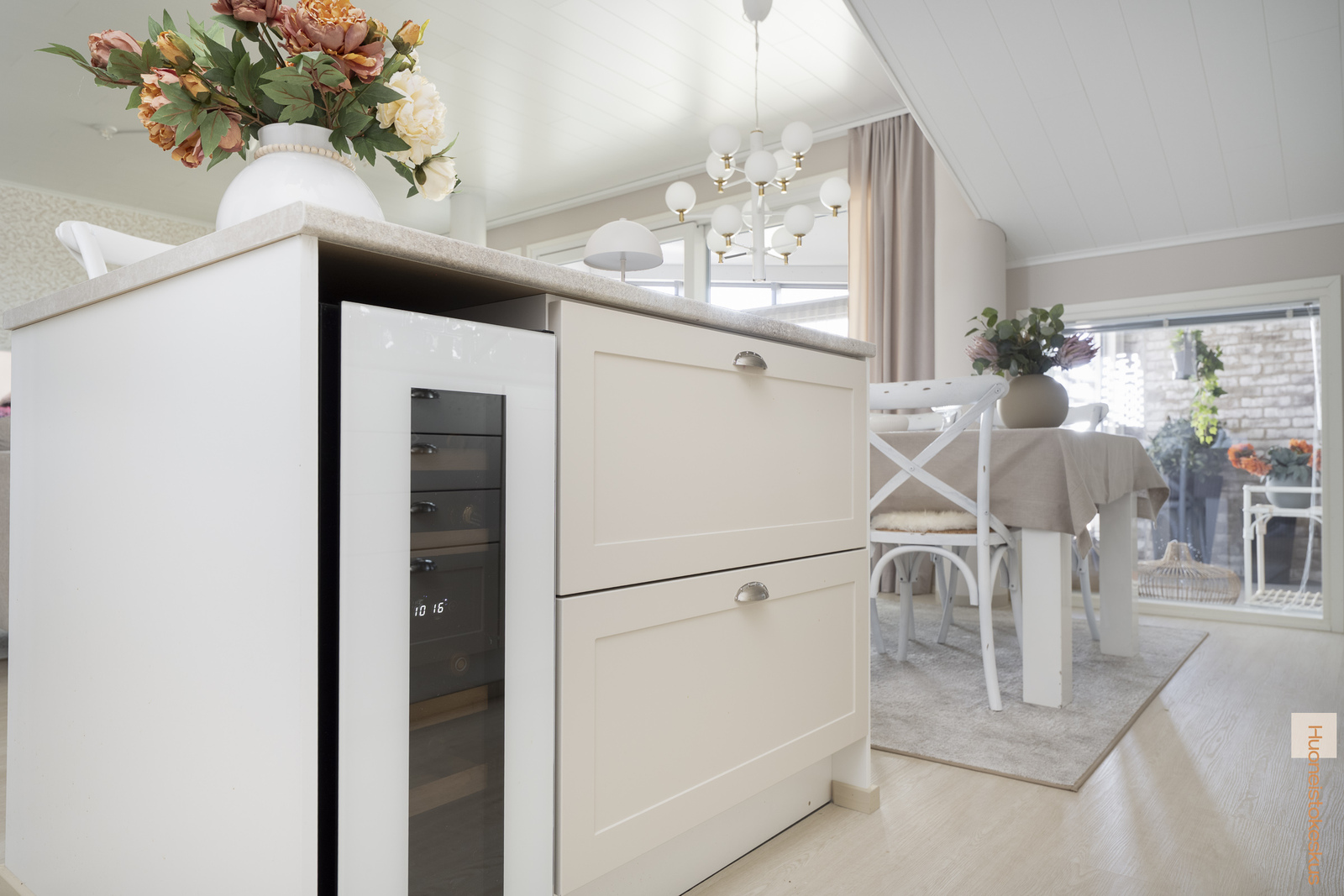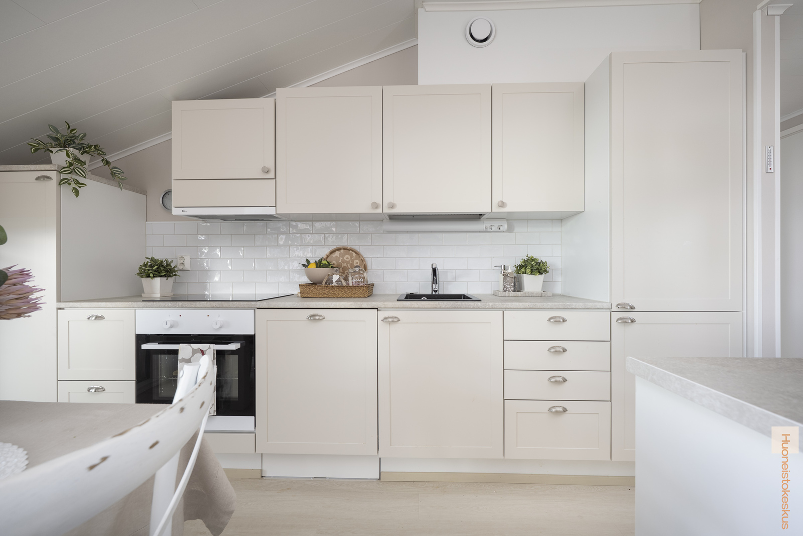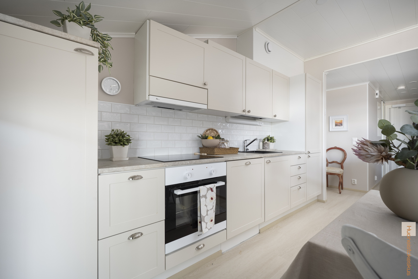 | Keittiön kuvaus | Liesi (Induktioliesi ja erillisuuni), työtasot (laminaatti), seinät (maali), lattiat (vinyyli), erillisuuni, liesituuletin, liesi, jääkaappipakastin ja astianpesukone |