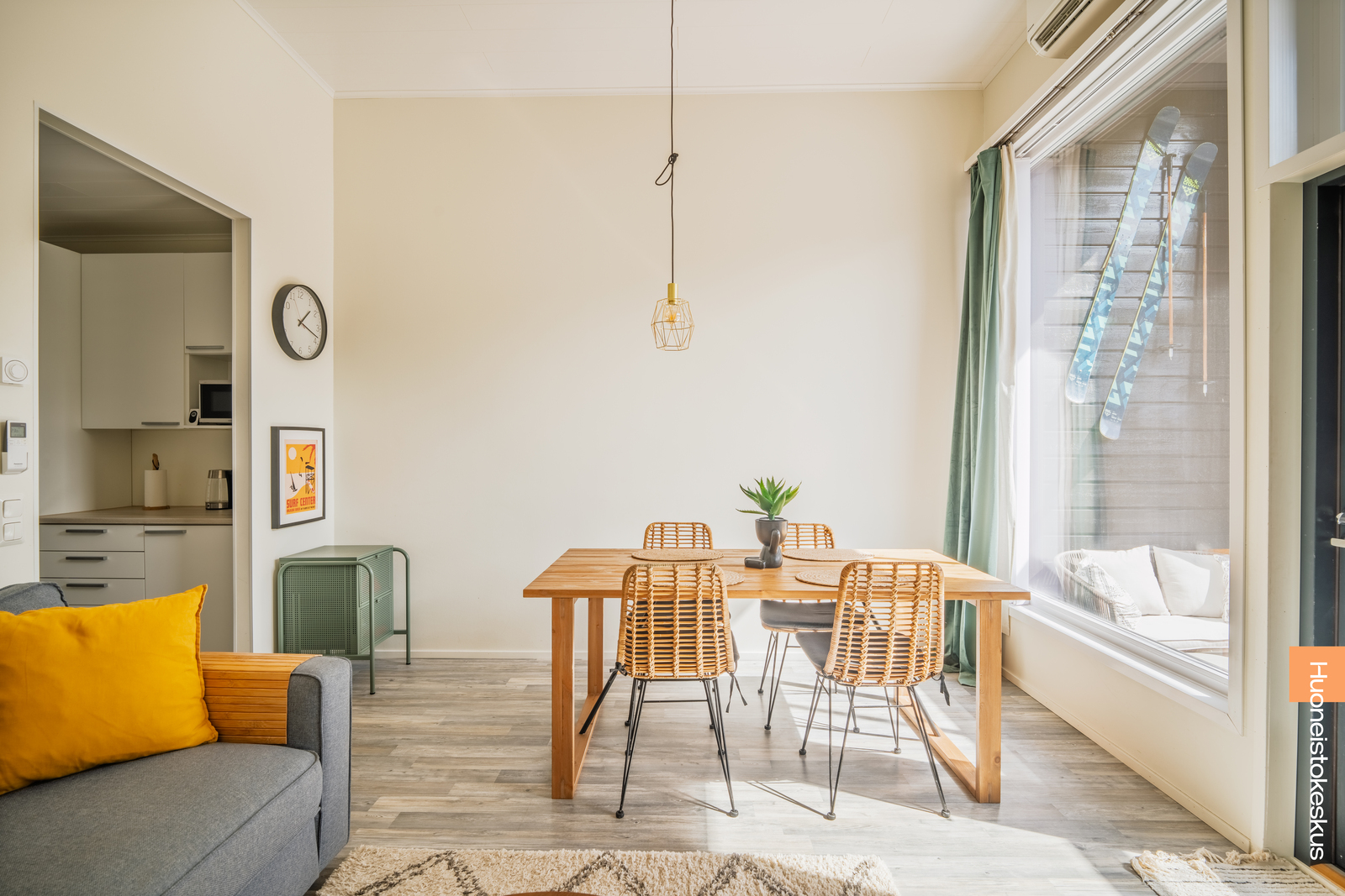 Nyt myynnissä siisti huoneisto Asunto Oy Kalajoen Hilmantorin ensimmäisestä kerroksesta. Asunnossa yksi makuuhuone, keittiö, olohuone, kylpyhuone ja oma sauna. Lisätilaa tuo lasitettu parveke. Katutason ansiosta parvekkeella on helppo tarvittaessa säilyttää myös pyöriä tai muita ulkoiluvarusteita.
