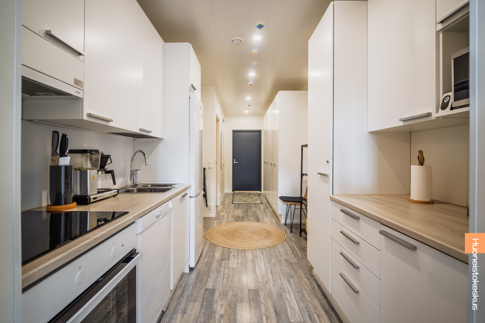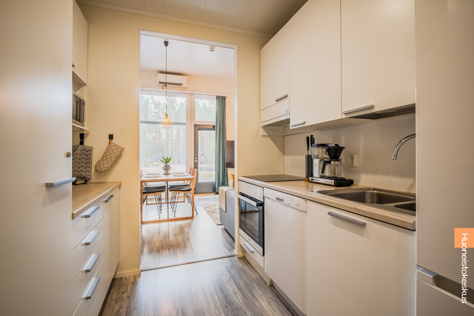 | Keittiön kuvaus | Liesi (Keraaminen liesi ja erillisuuni), työtasot (laminaatti), seinät (maali), lattiat (laminaatti), erillisuuni, liesituuletin, jääkaappipakastin ja astianpesukone |