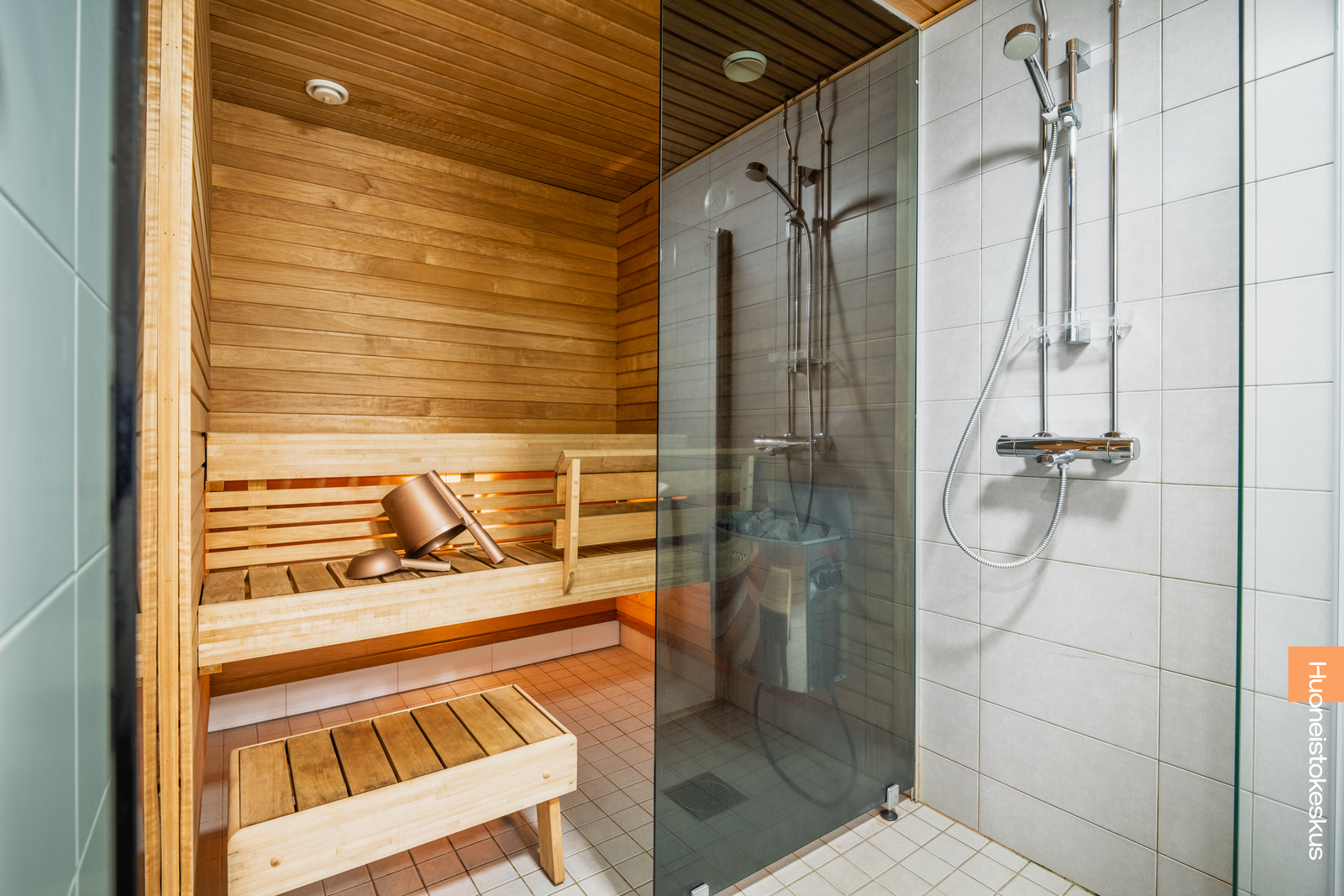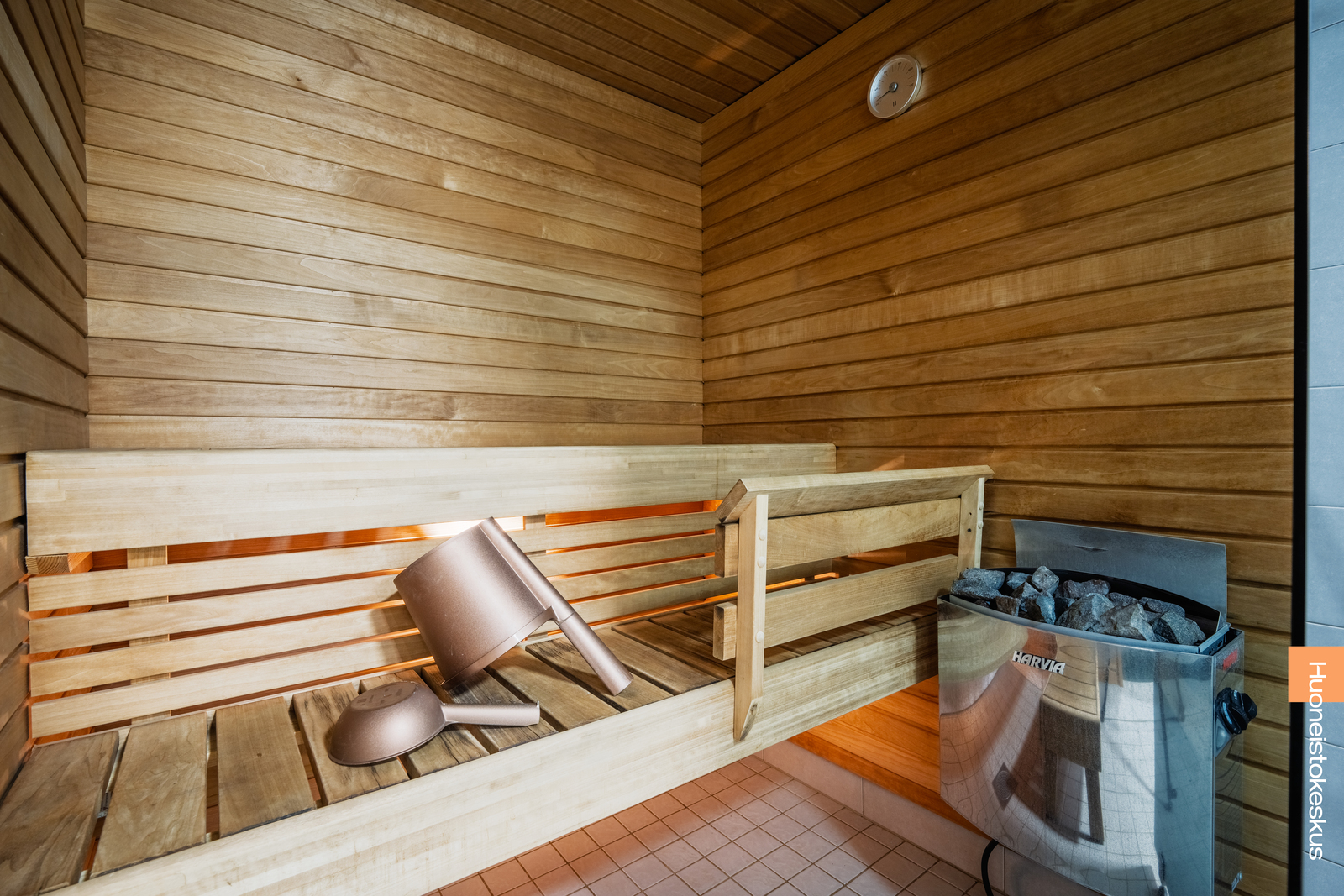 | Saunan kuvaus | Seinät (puu), lattiat (laatta), Sähkökiuas |
