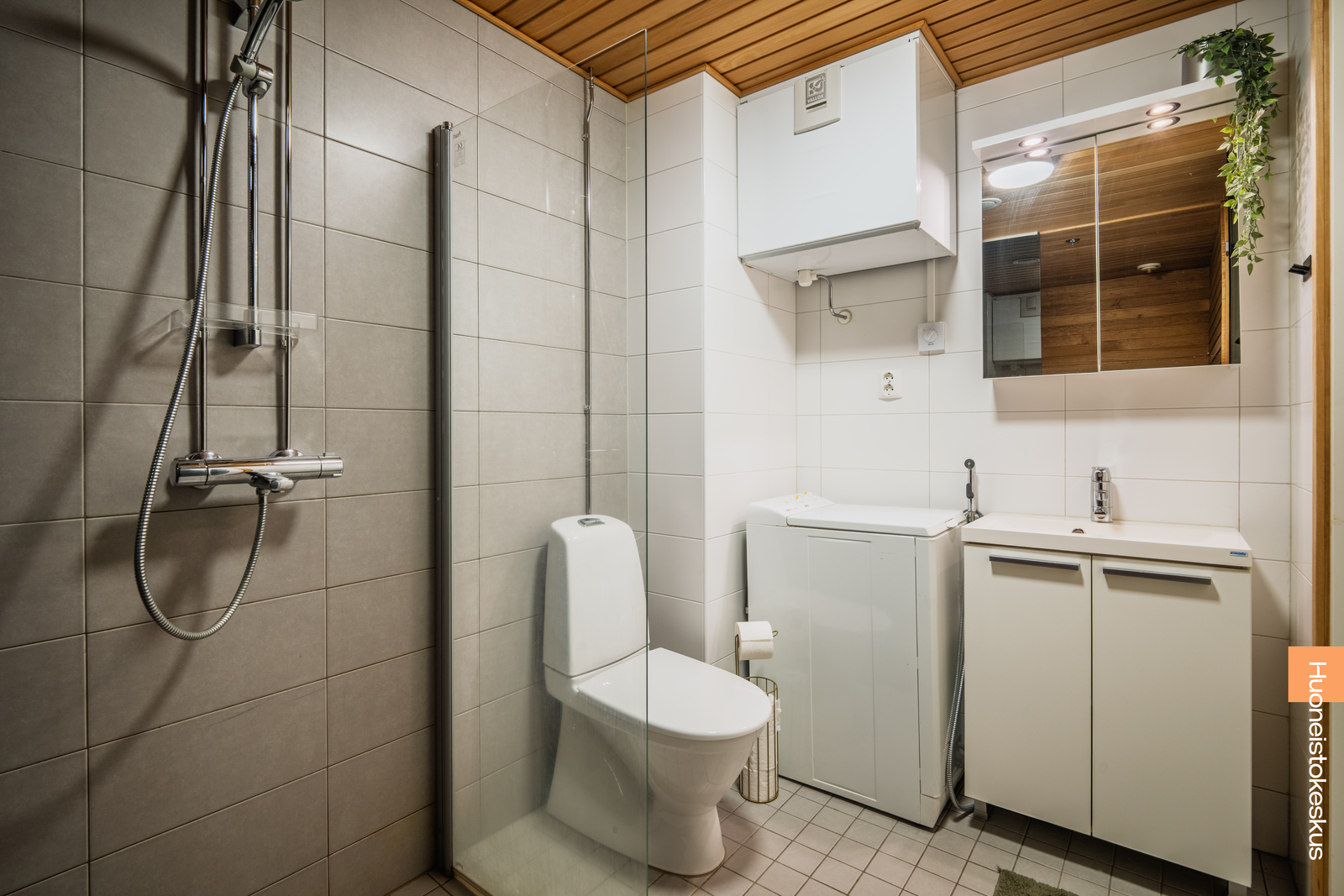 | Kylpyhuoneen kuvaus | Suihku, lattialämmitys, suihkuseinä, wc-istuin, peilikaappi, pesukoneliitäntä ja kiinteät valaisimet, seinät (kaakeli), lattiat (laatta) |