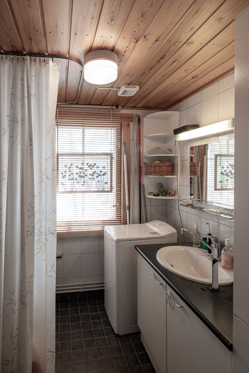 | Kylpyhuoneen kuvaus | Pesukoneliitäntä, wc-istuin, peilikaappi, suihku ja allaskaappi, seinät (kaakeli), lattiat (laatta) |