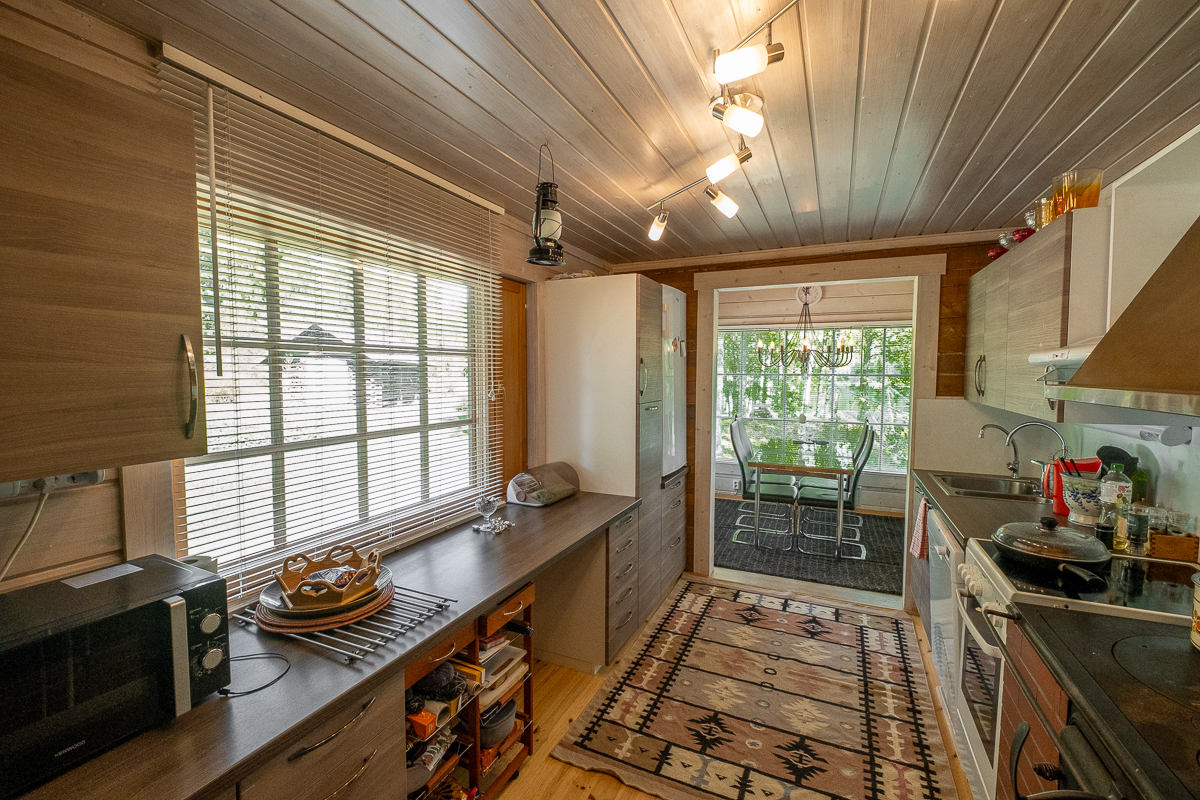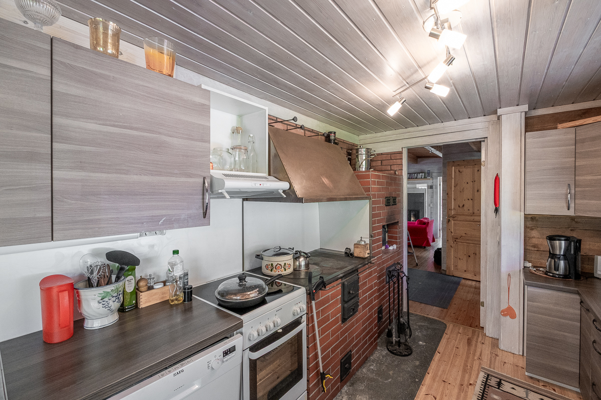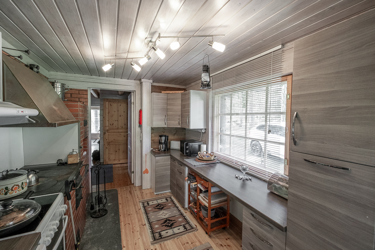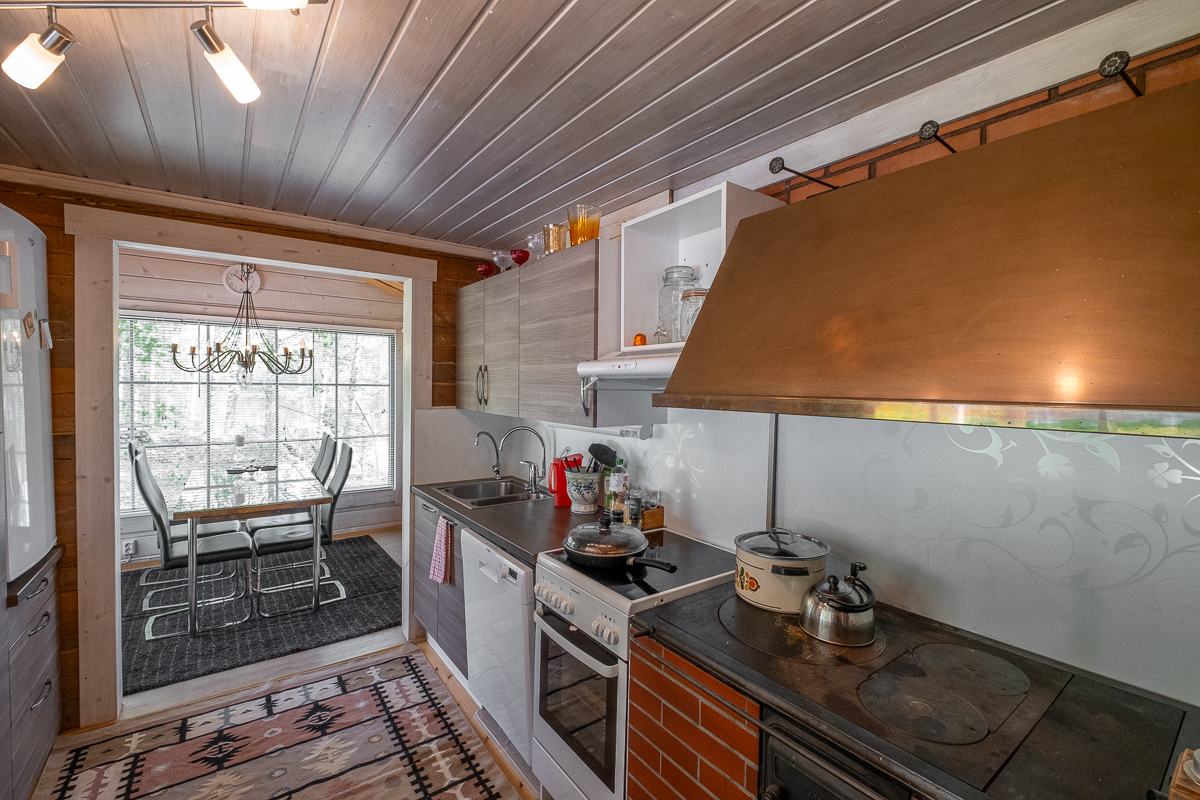 | Keittiön kuvaus | Liesi (Keraaminen liesi ja puuliesi, leivinuuni), työtasot (laminaatti), seinät (maali ja puu), lattiat (lauta), uuni, astianpesukone, jääkaappi, liesi ja liesituuletin |