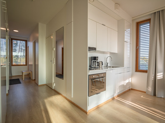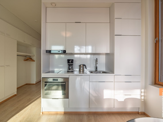 Liesi (Induktioliesi ja erillisuuni), työtasot (laminaatti), seinät (maali), lattiat (laminaatti), jääkaappipakastin, erillisuuni, liesi, astianpesukone ja kiinteät valaisimet |