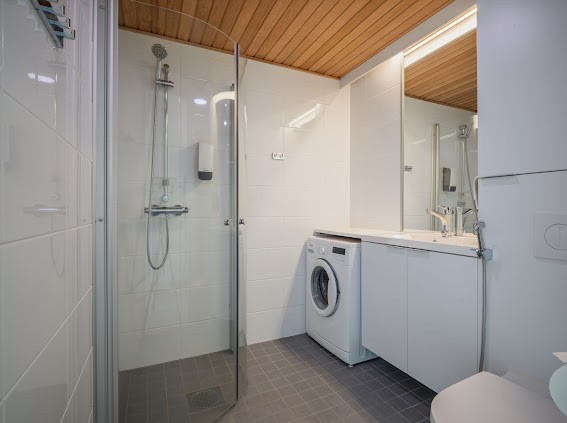 Lattialämmitys, pesukone, peili, suihkuseinä, suihku, wc-istuin, allaskaappi ja kiinteät valaisimet, seinät (kaakeli), lattiat (laatta) |