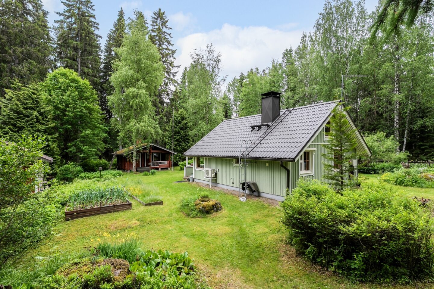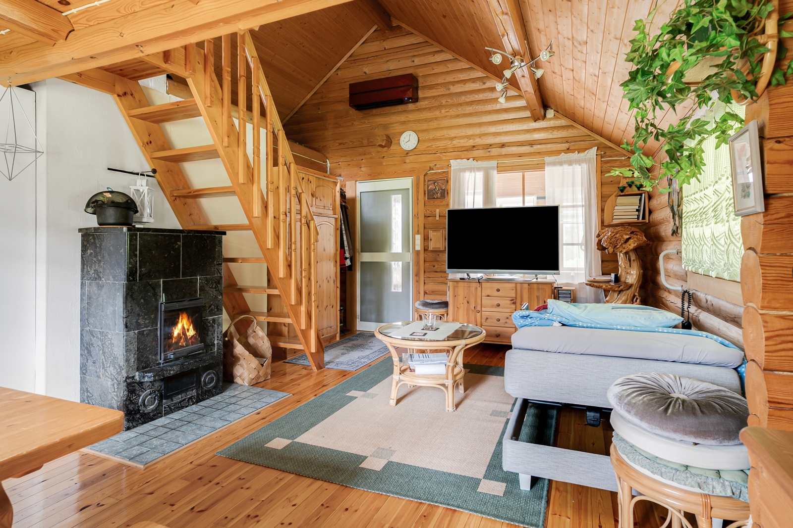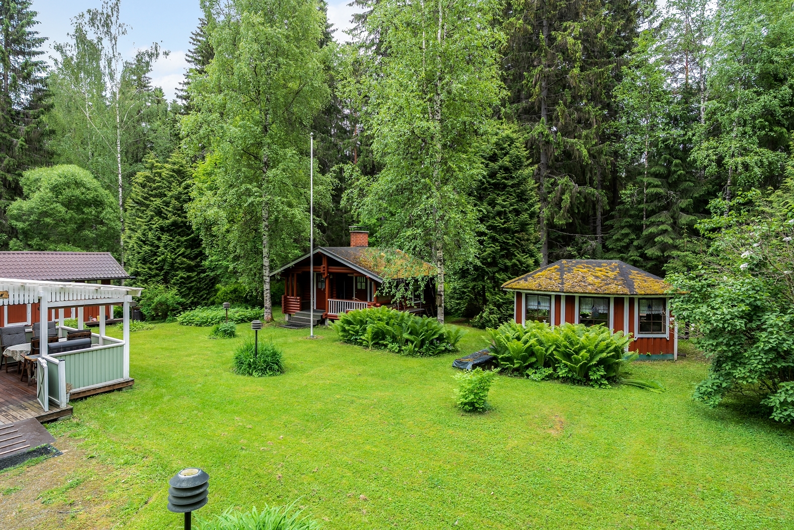 Perinteinen hirsirakenteinen mökki huokuu lämpöä ja kodikkuutta. Pihapiiristä löytyy useita rakennuksia, kuten sauna ja grillikeittiö – täydellinen paikka rentoutumiseen, luonnosta nauttimiseen ja kiireettömiin hetkiin.