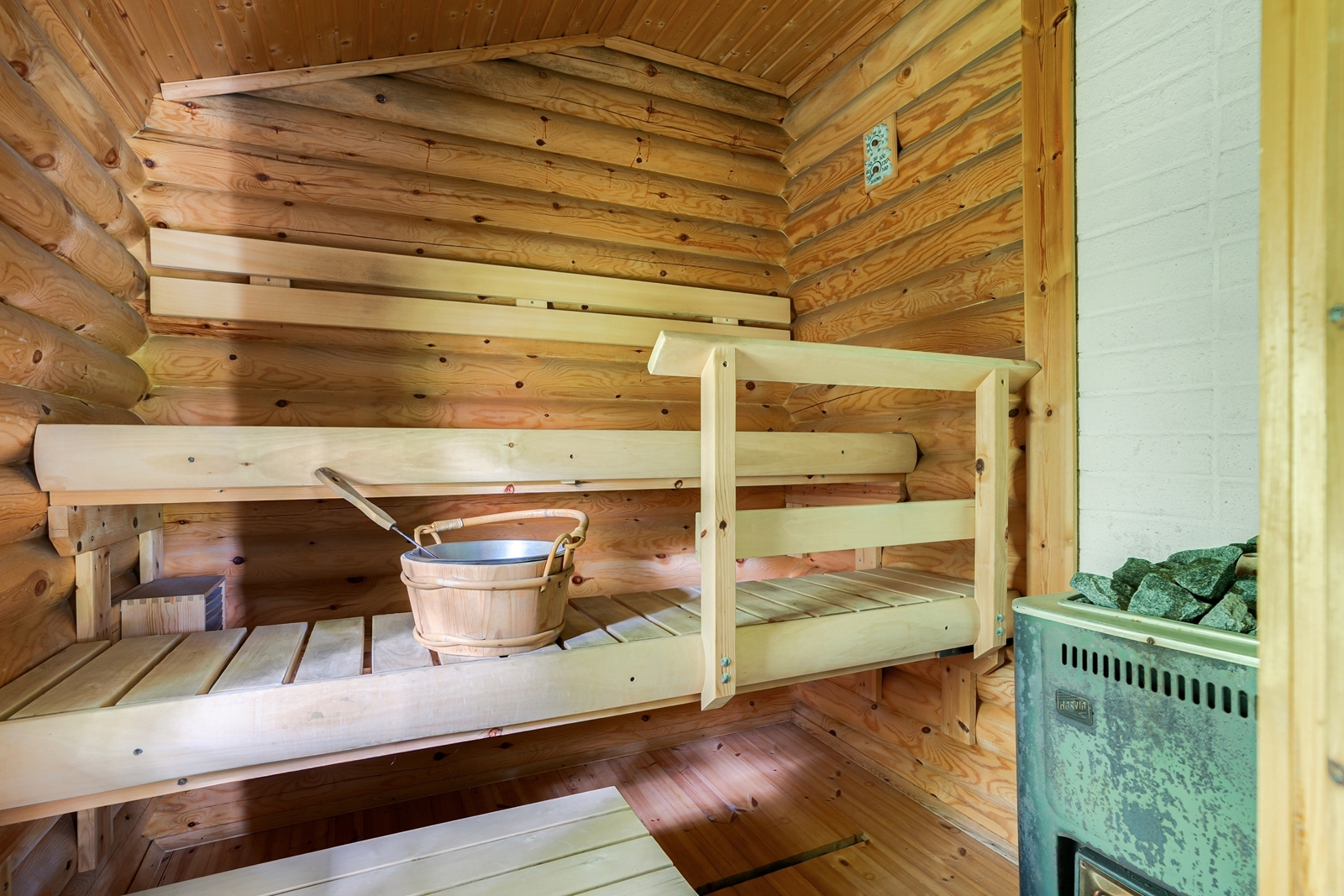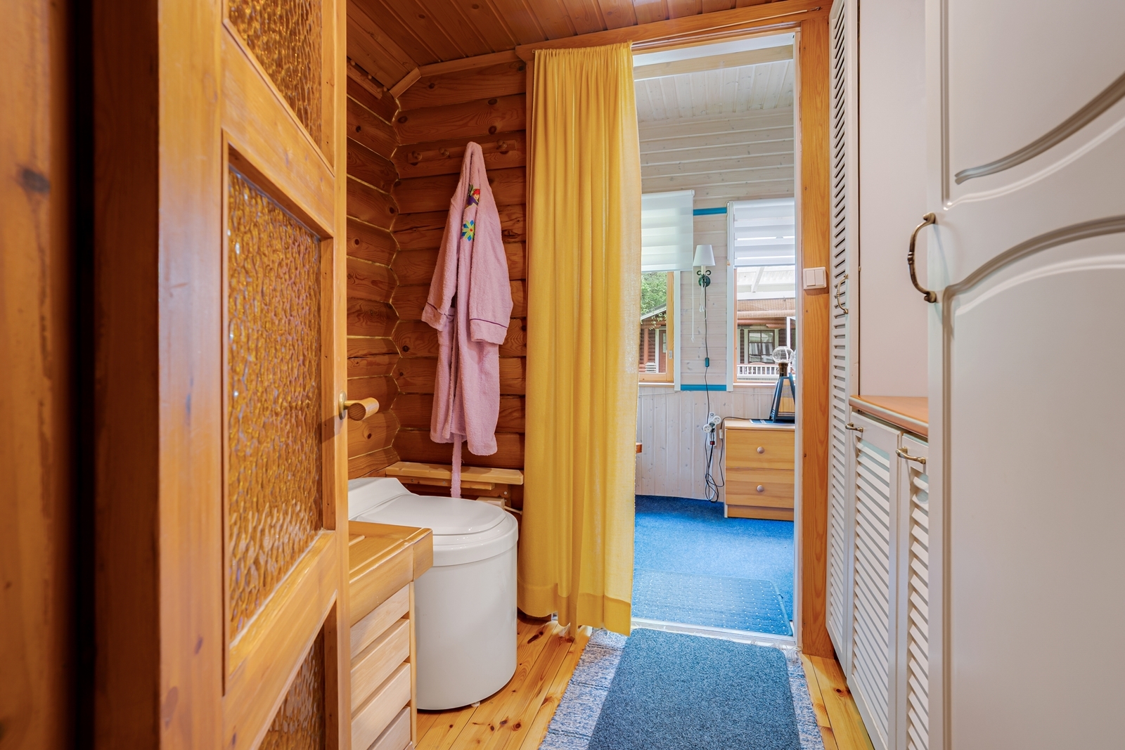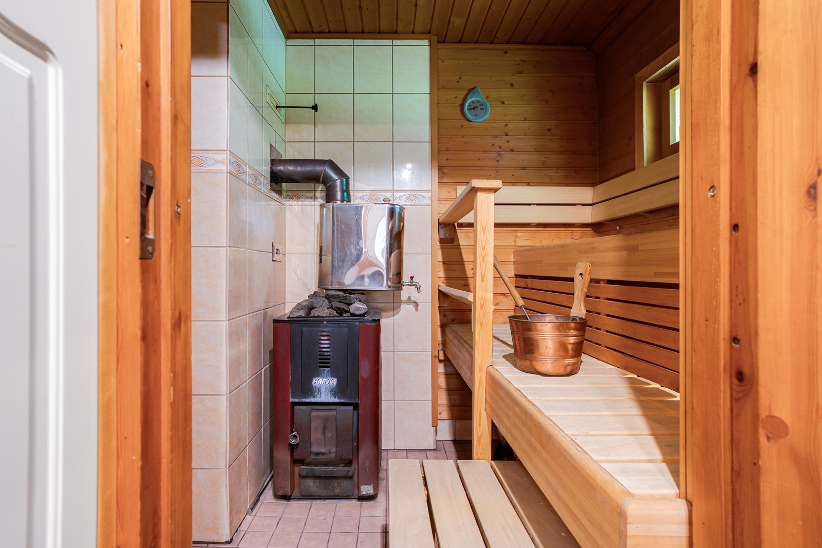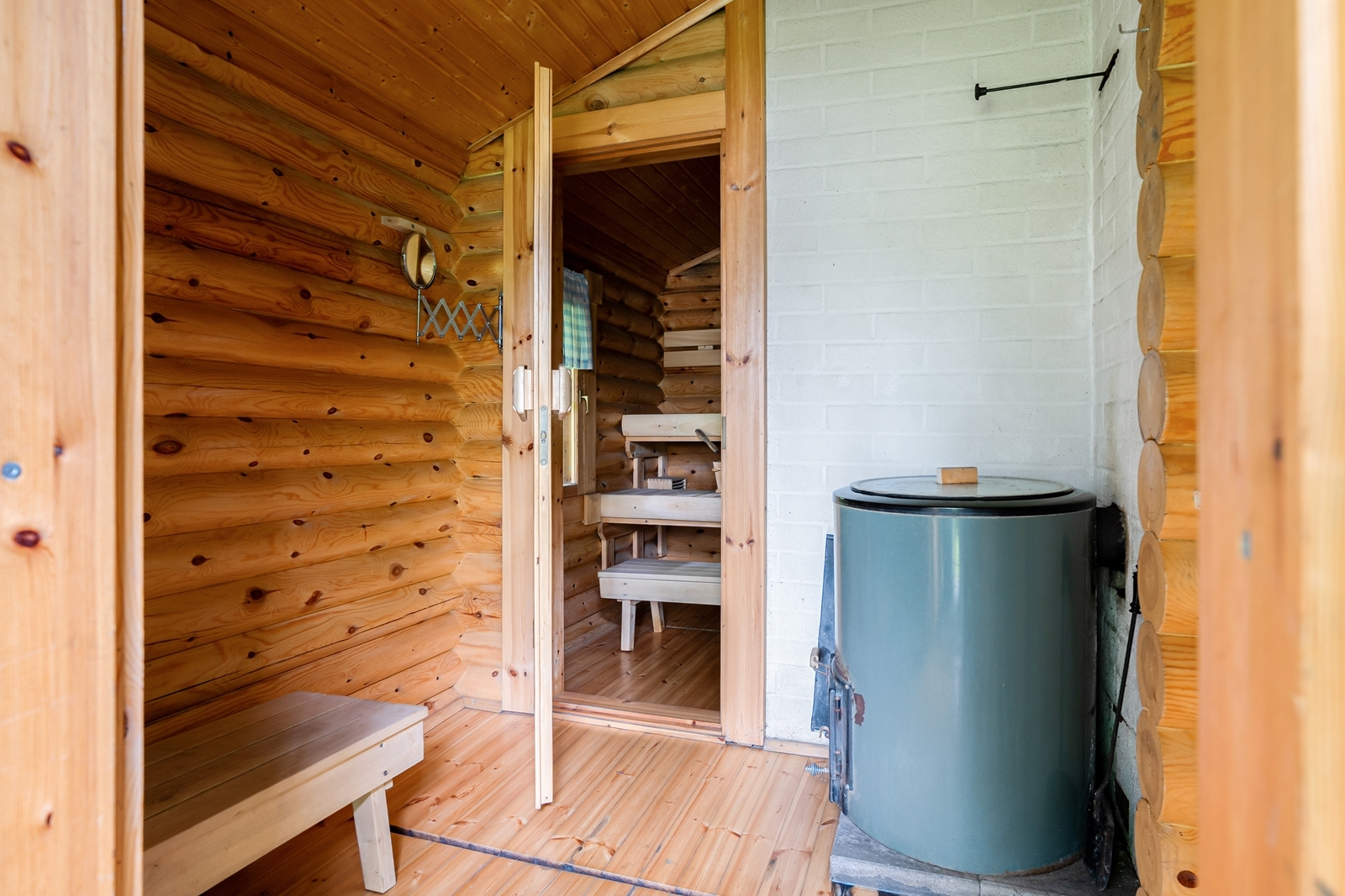 Seinät (kaakeli), lattiat (lauta), Puukiuas, Mökissä sauna ja toinen erillisessä rakennuksessa. |