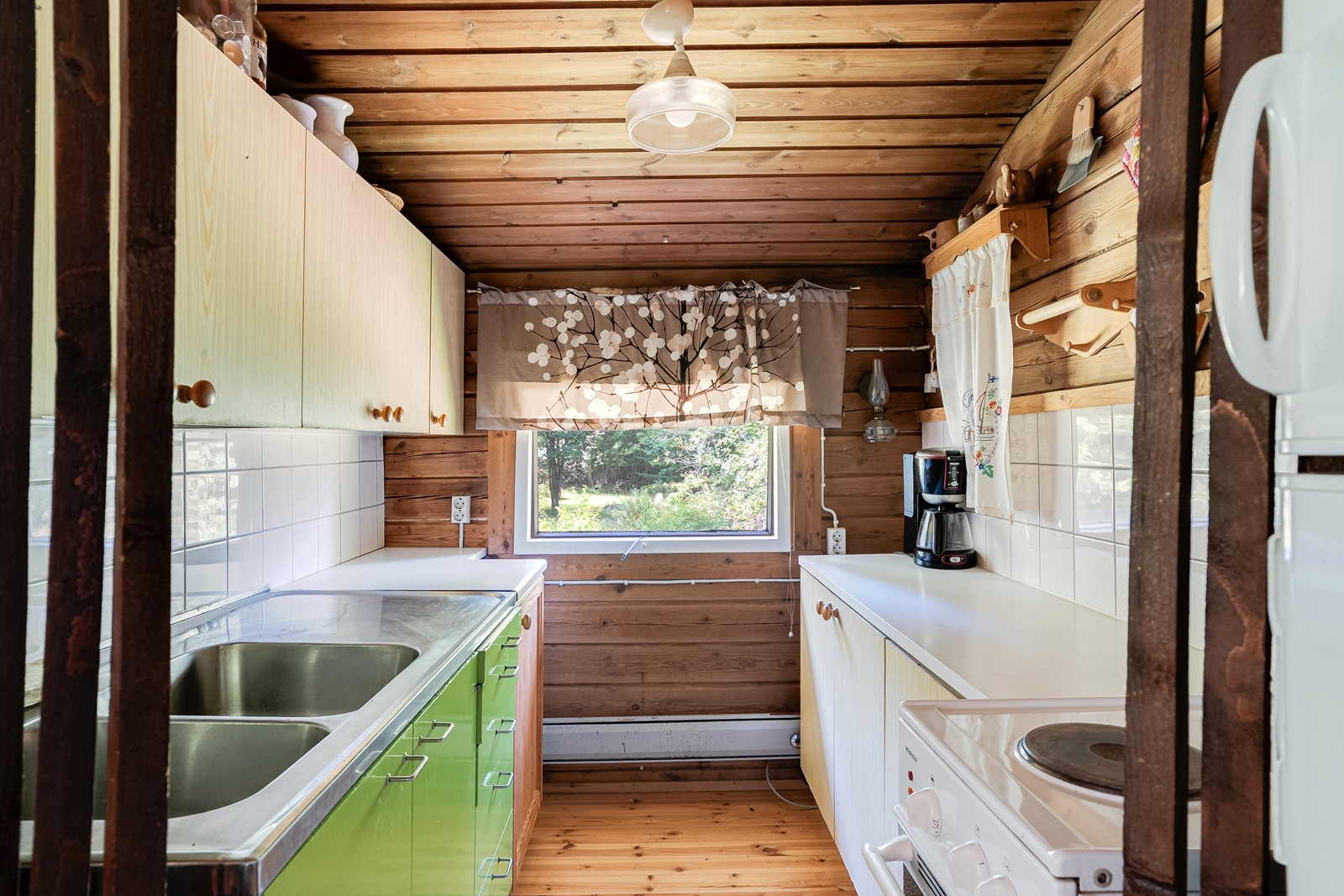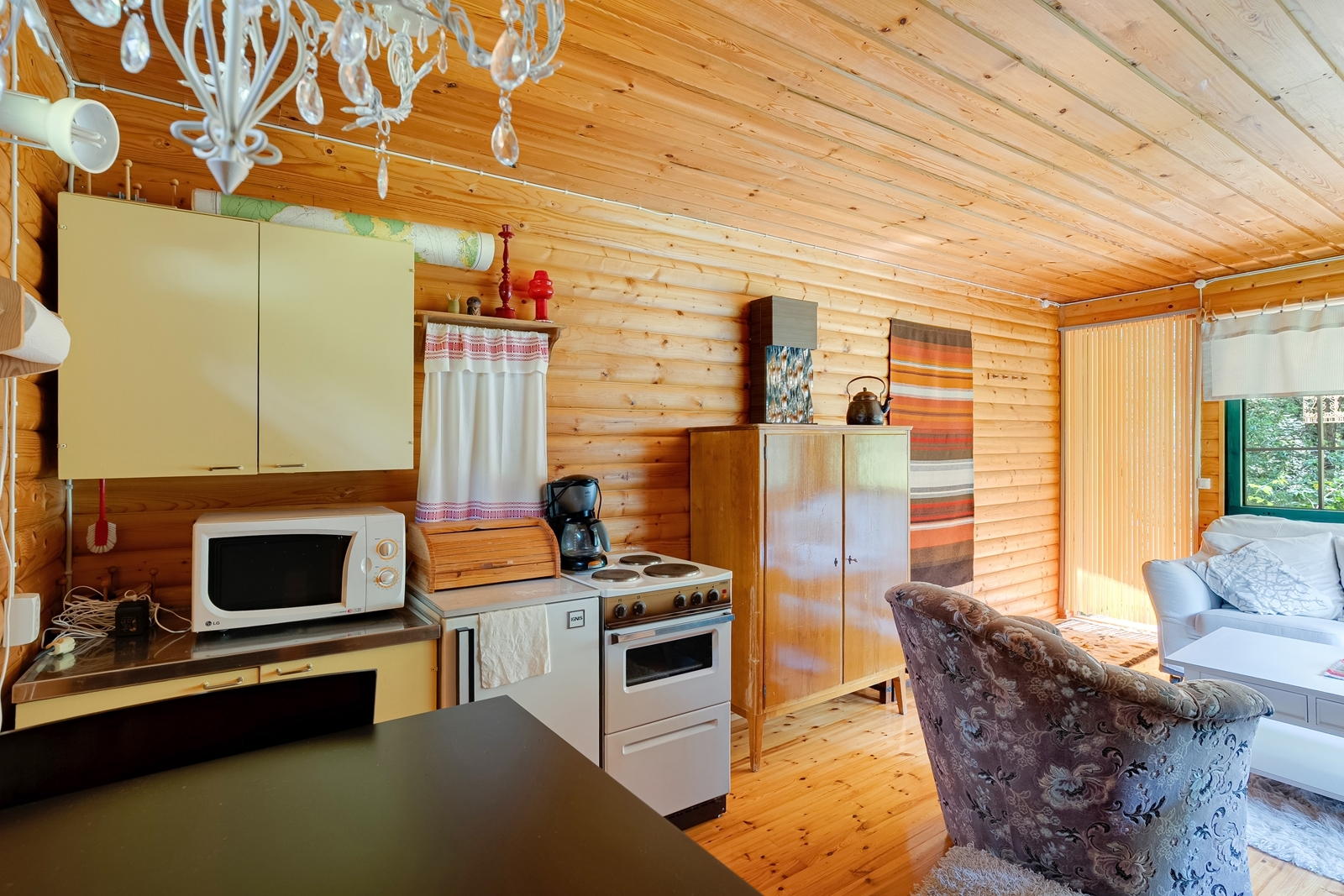 Liesi (Keraaminen liesi), työtasot (puu), seinät (puu), lattiat (lauta), jenkkikaappi |