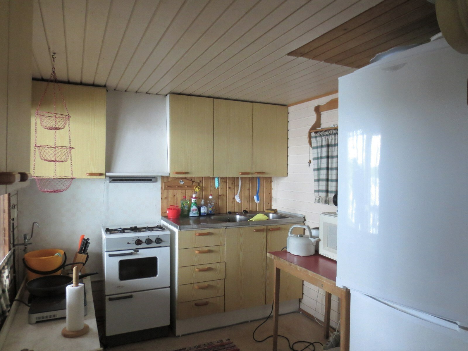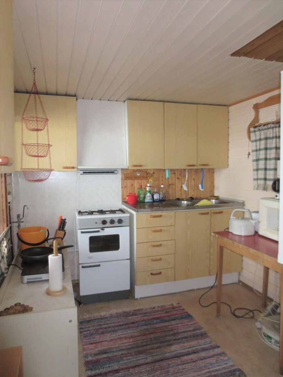 Liesi (Induktioliesi ja kaasuliesi), seinät (puu), lattiat (laminaatti), jääkaappi, liesi ja erillinen pakastin |