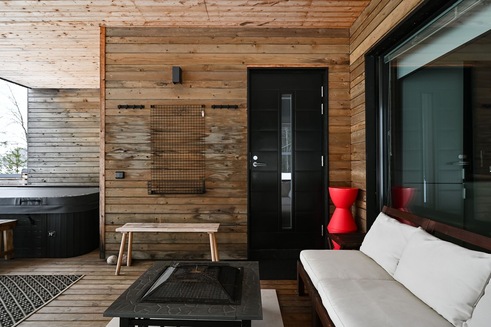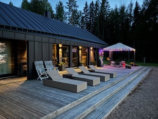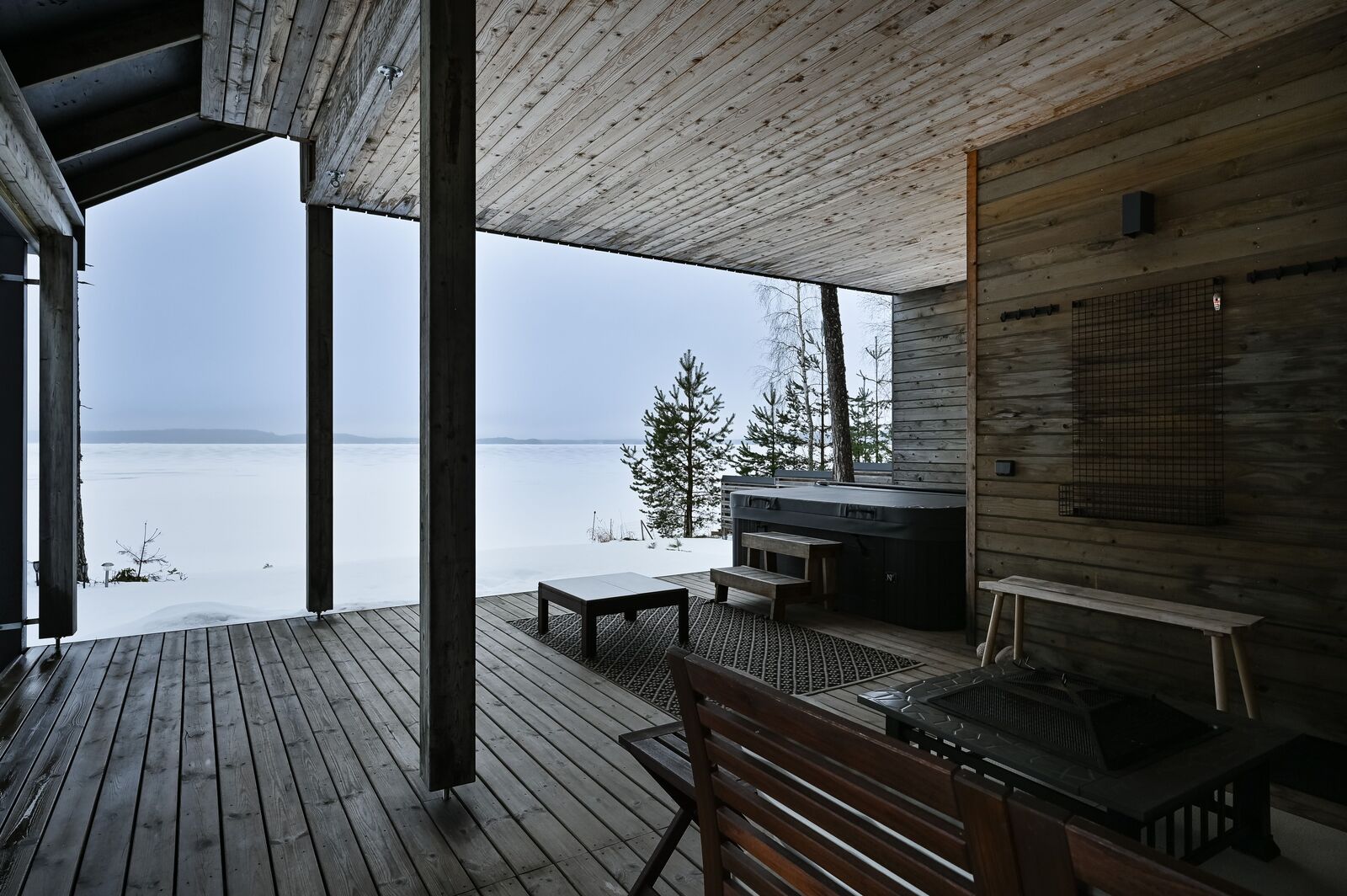 Erillinen saunarakennus, jossa nautit löylyttelystä samalla nauttien järvimaisemasta ja porealtaassa voit rentoutua saunan lomassa.