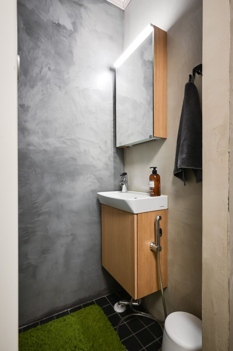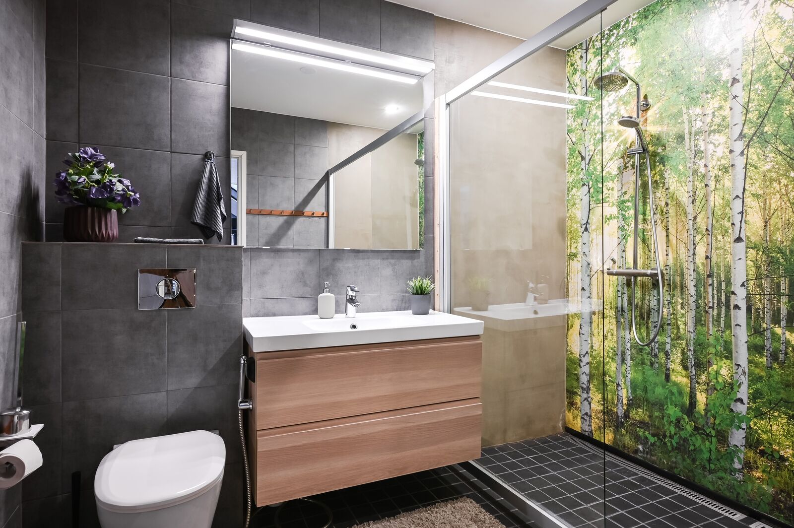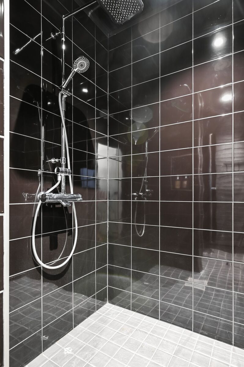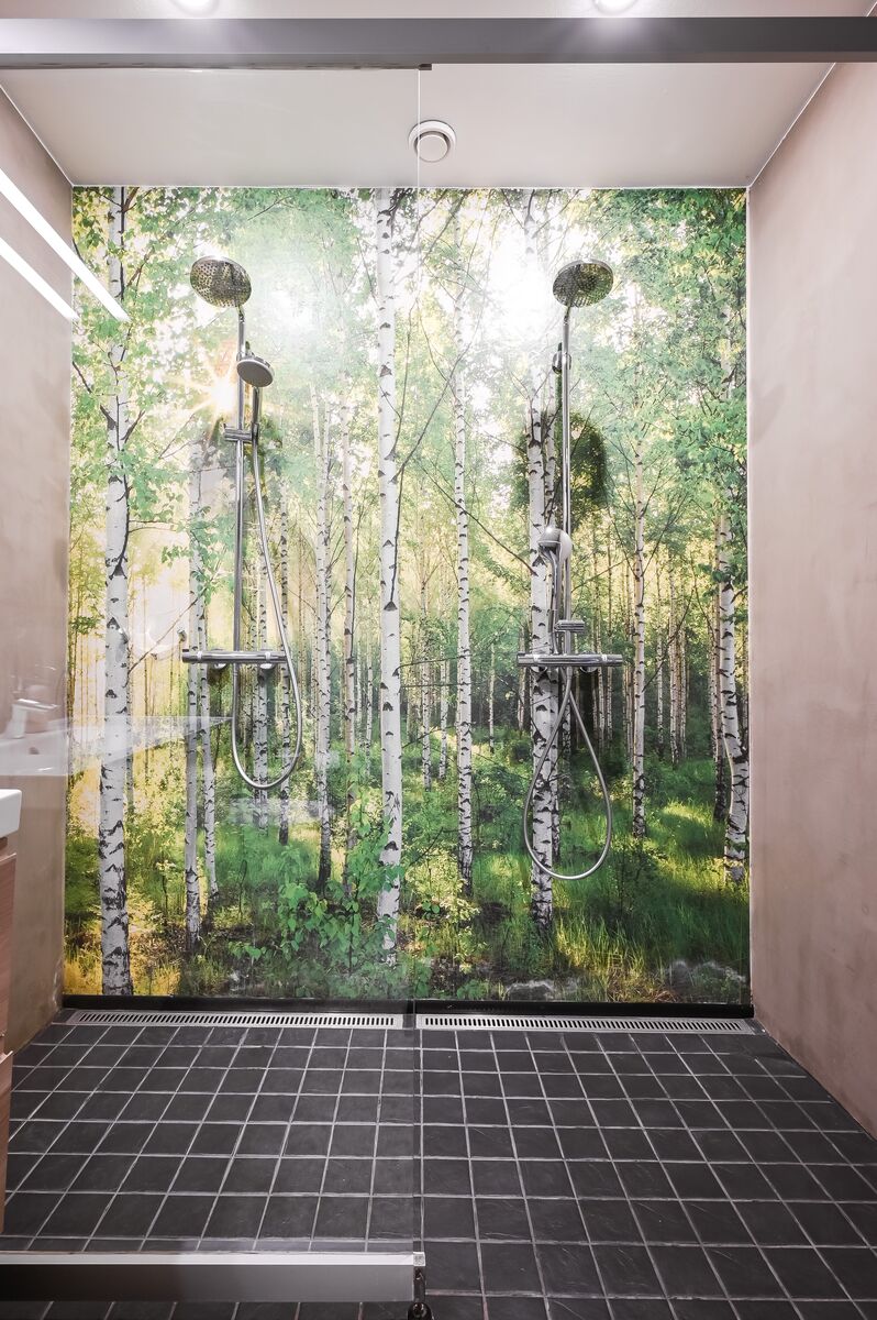 Suihkuseinä, lattialämmitys, suihku, wc-istuin, peili ja kiinteät valaisimet, seinät (kaakeli ja tapetti), lattiat (laatta) |
