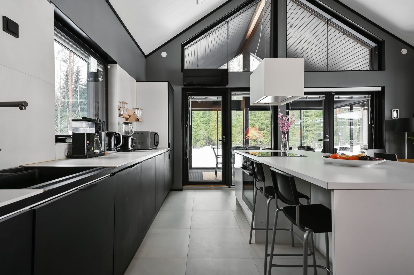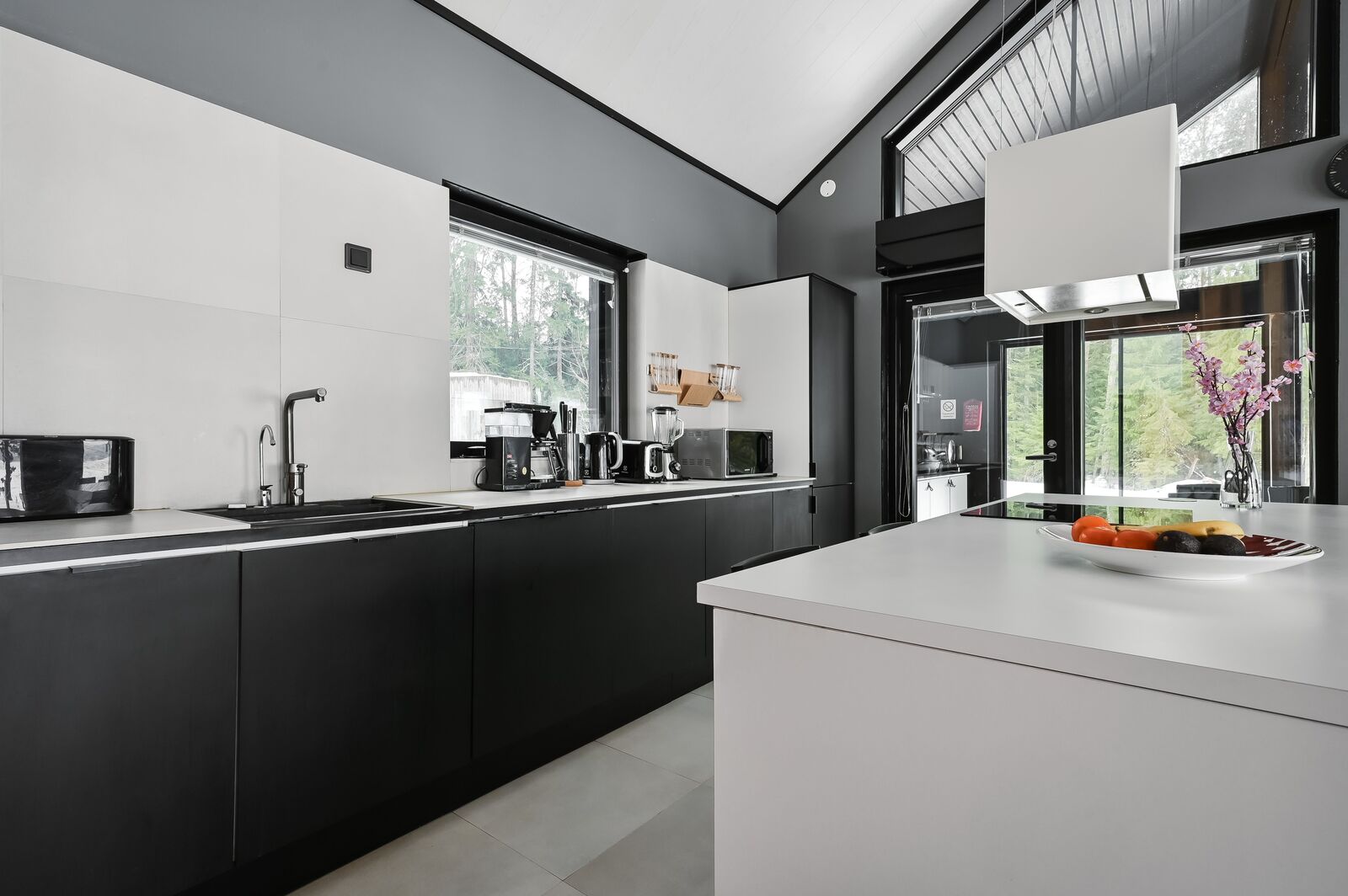 Lasitettu kesäkeittiö jossa kesävesipiste ja liesituuletin, piippuvaraus. |