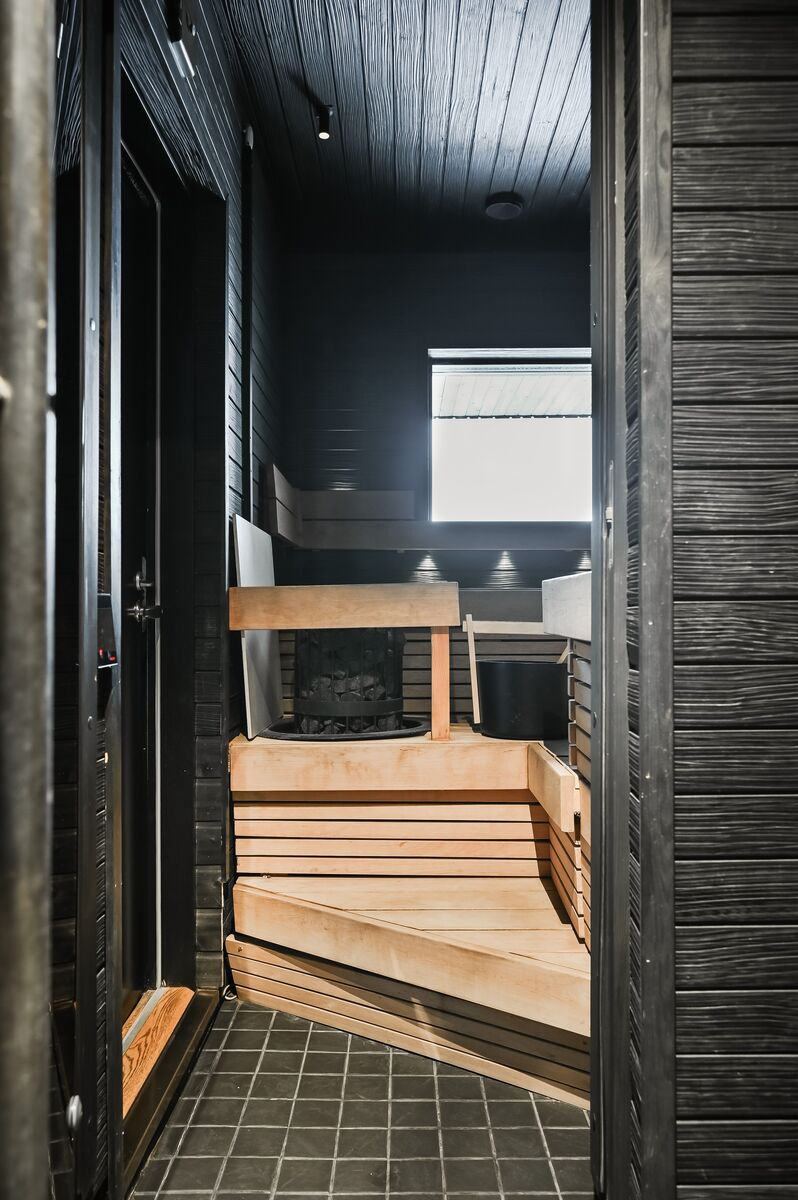 Seinät (puu), lattiat (laatta), Sähkökiuas, Saunarakennus on erillinen, hormivaraus puukiuasta varten |