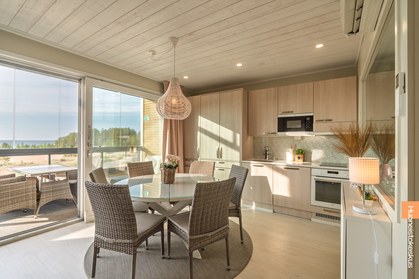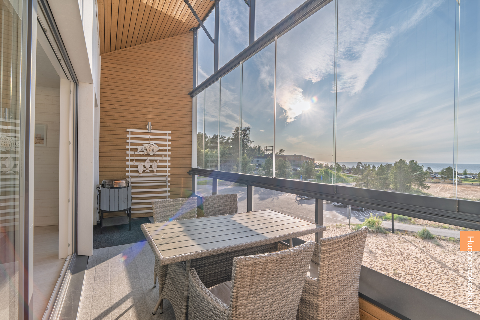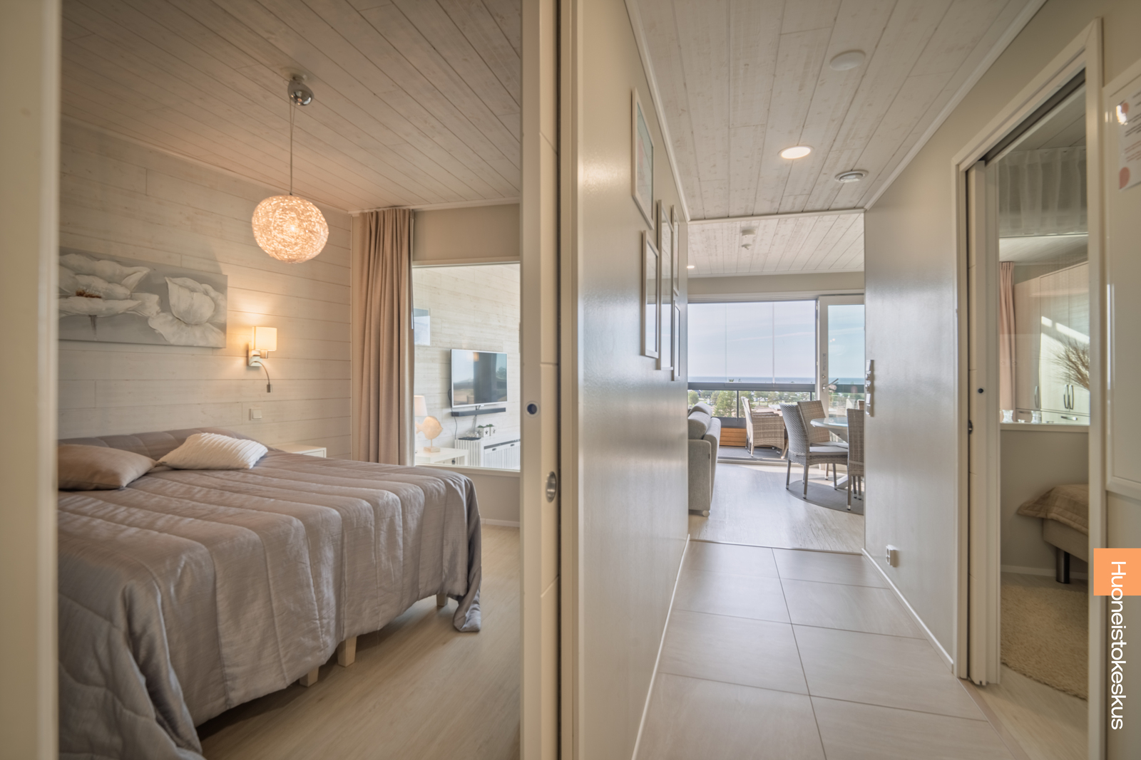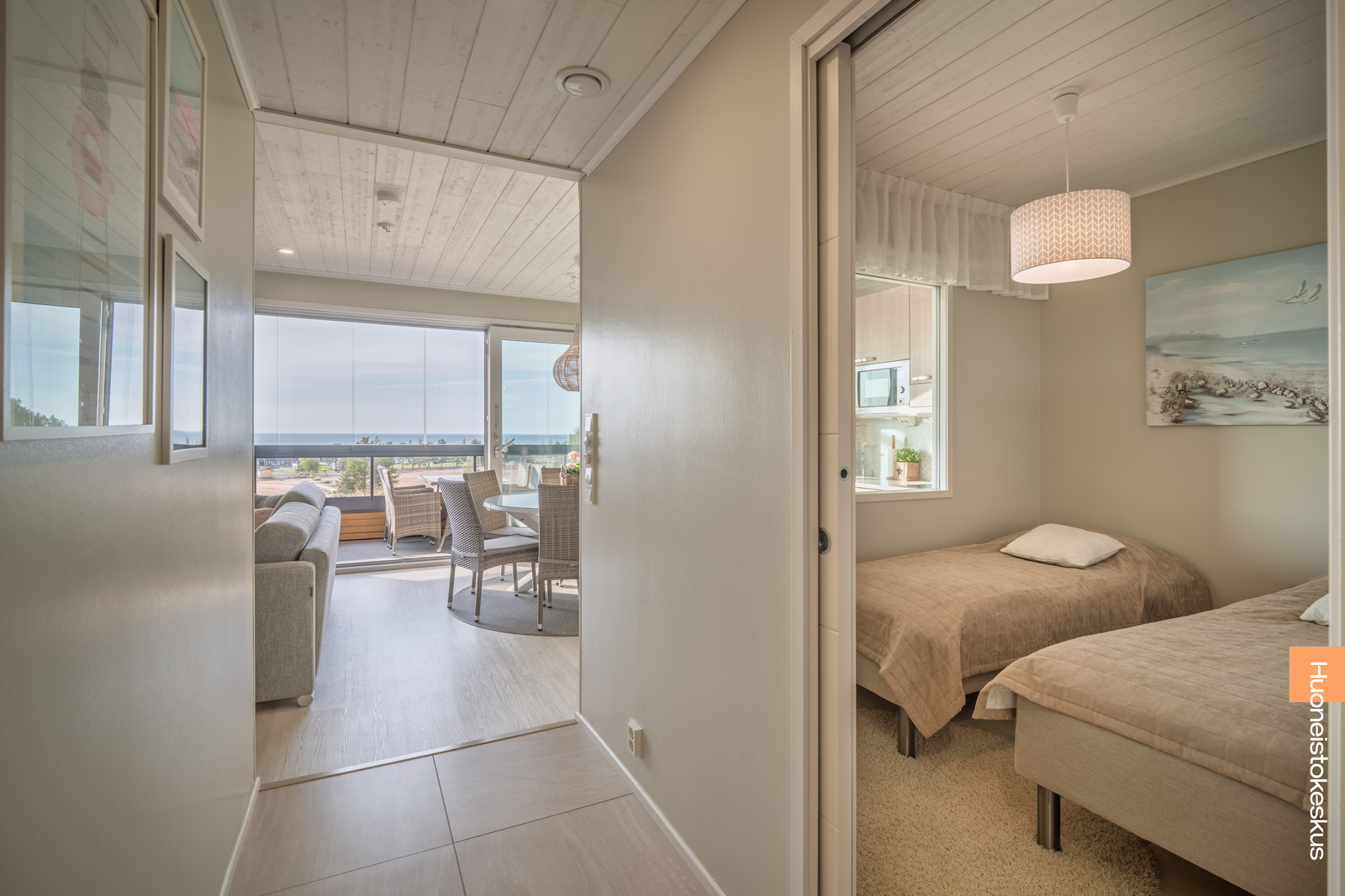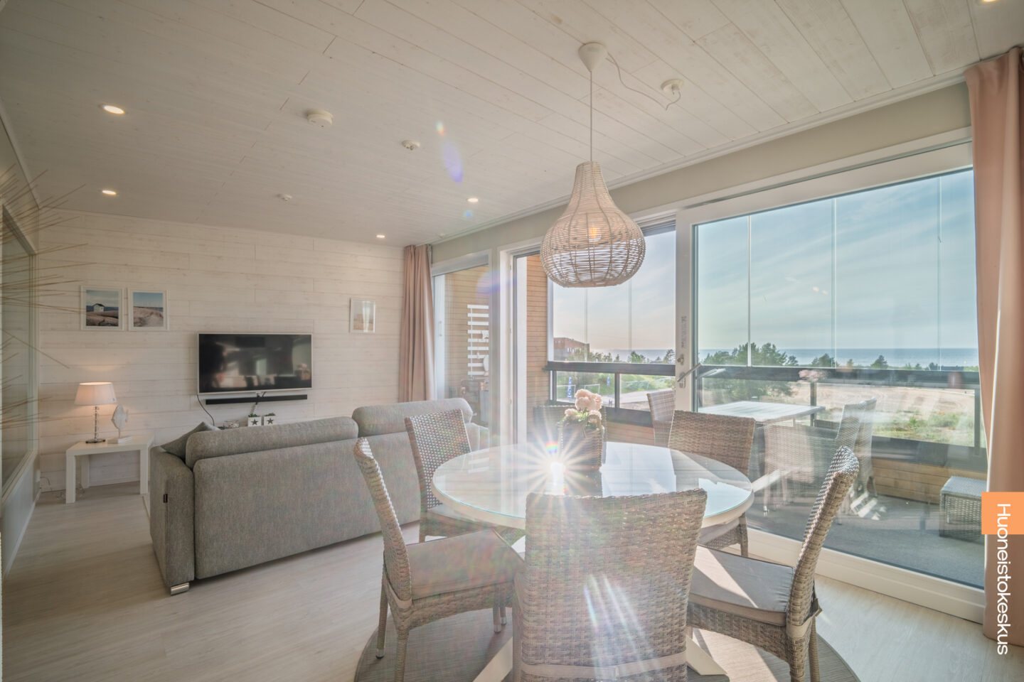 Nyt myynnissä loistavalla merinäköalalla varustettu ylimmän kerroksen huoneisto, aivan Hiekkasärkkien palveluiden vieressä. Asunnossa tilava tupakeittiö, kaksi makuuhuonetta, vaatehuone, kylpyhuone ja oma sauna. Sisäikkunat tuovat maiseman hienosti esiin myös makuuhuoneista ja saunasta. Lasitettu parveke antaa lisää oleskelutilaa asuntoon.