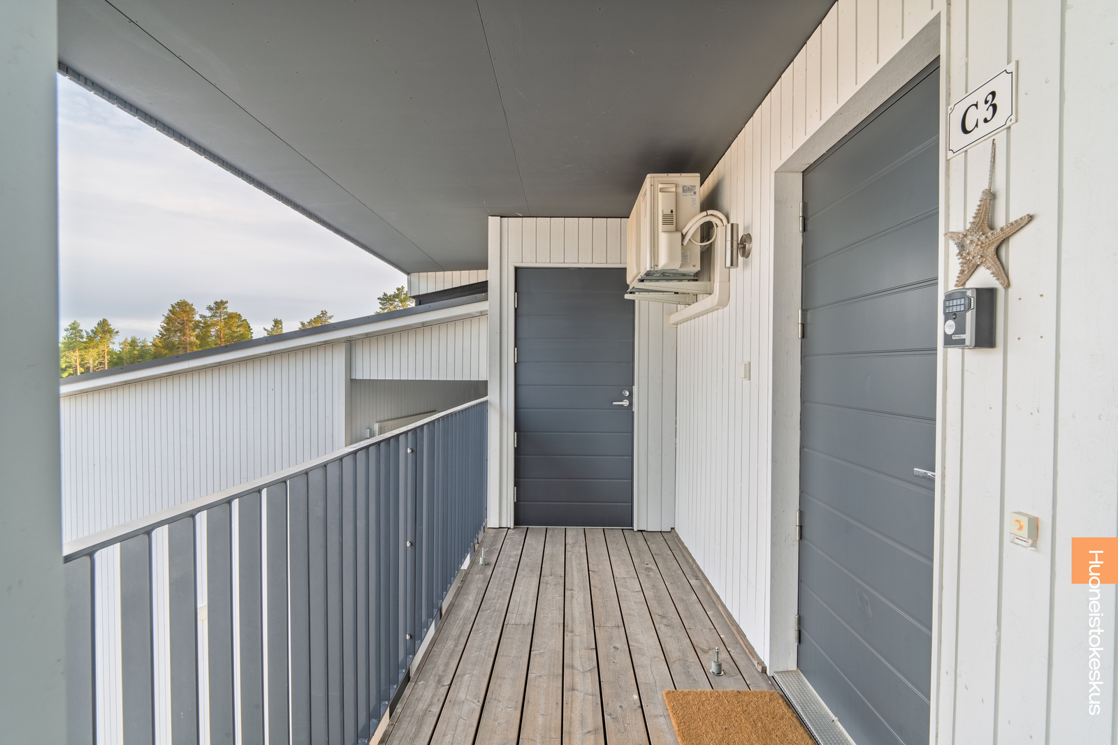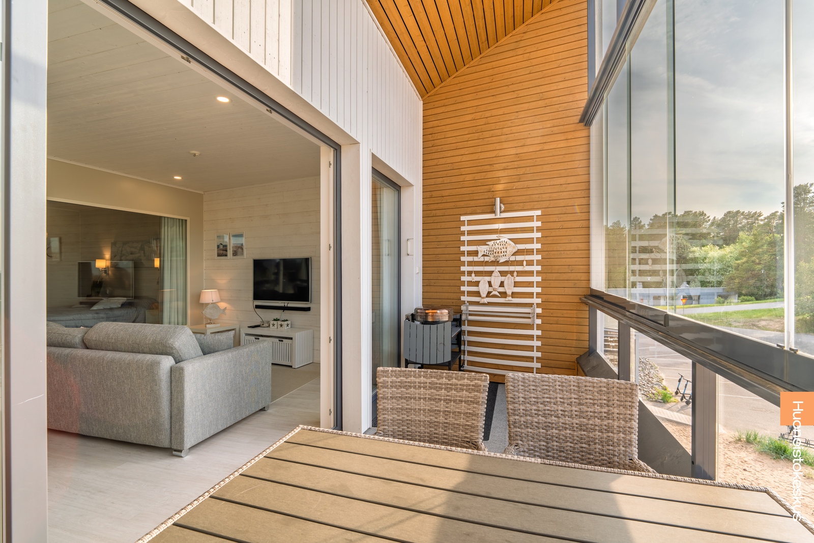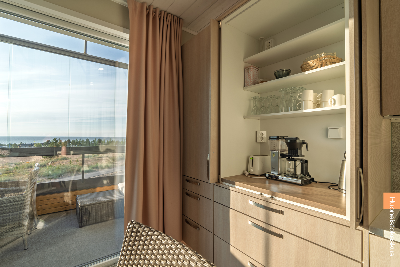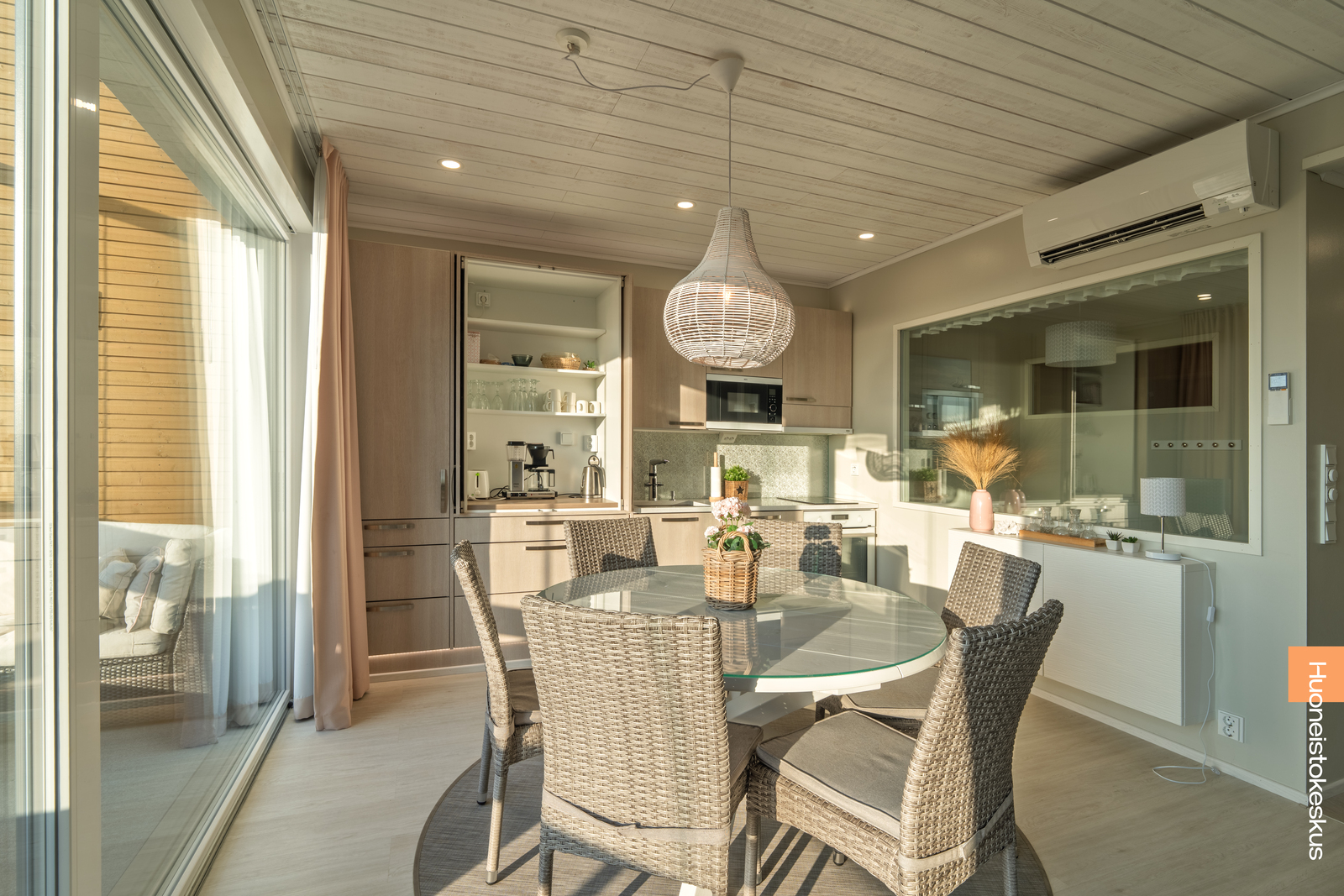 Huoneisto myydään täysin kalustettuna ja varusteltuna, joten kohde on heti valmis lomailuun tai sijoituskäyttöön. Varustelutasoon on satsattu rakennusvaiheessa ja asunnosta löytyykin tyylikkäät pintamateriaalit, tilaa säästävät liukuovet ja viilentävä ilmalämpöpumppu. Keittiössä aamiaiskaappi, kivitaso ja integroidut kodinkoneet. Ulkoiluvälineille oma varasto sisäänkäynnin vieressä.