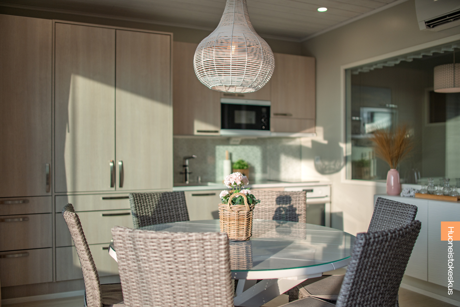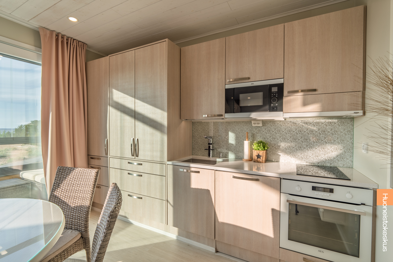 | Keittiön kuvaus | Liesi (Induktioliesi ja erillisuuni), työtasot (kivi), seinät (maali), lattiat (vinyyli), liesi, jääkaappipakastin, astianpesukone, erillisuuni ja kiinteät valaisimet |