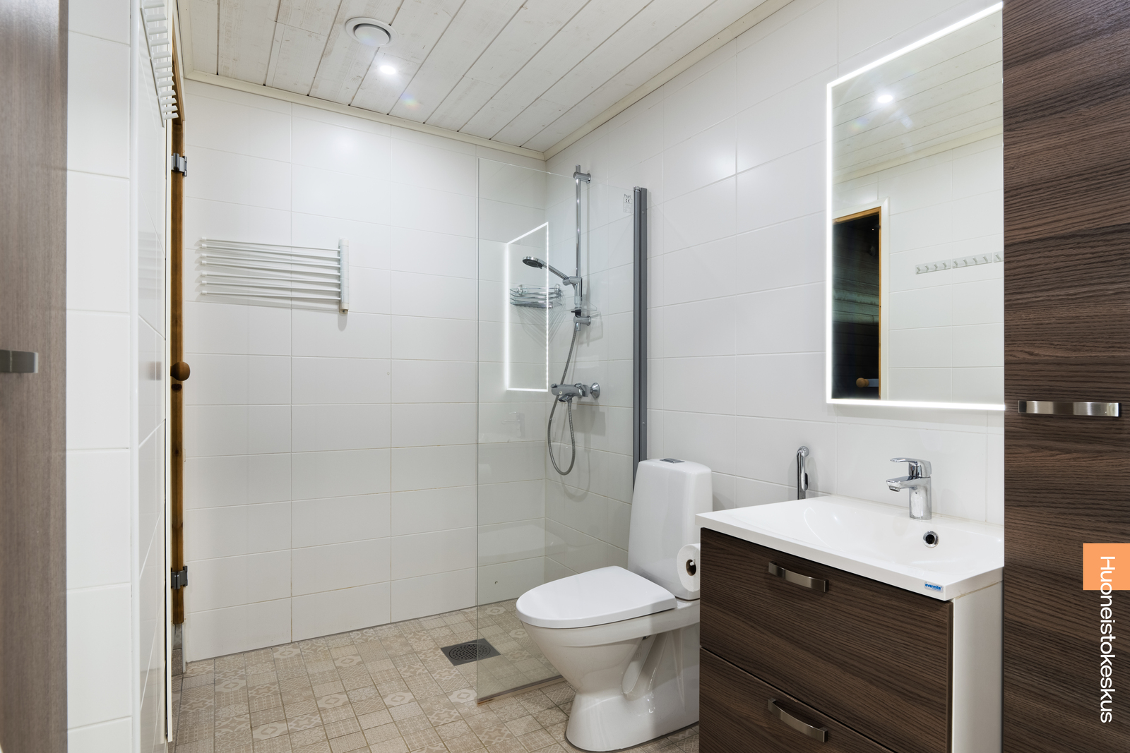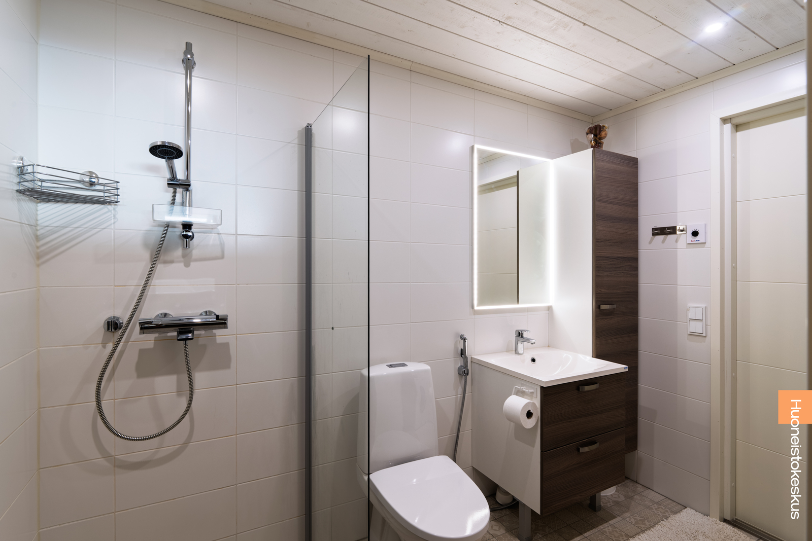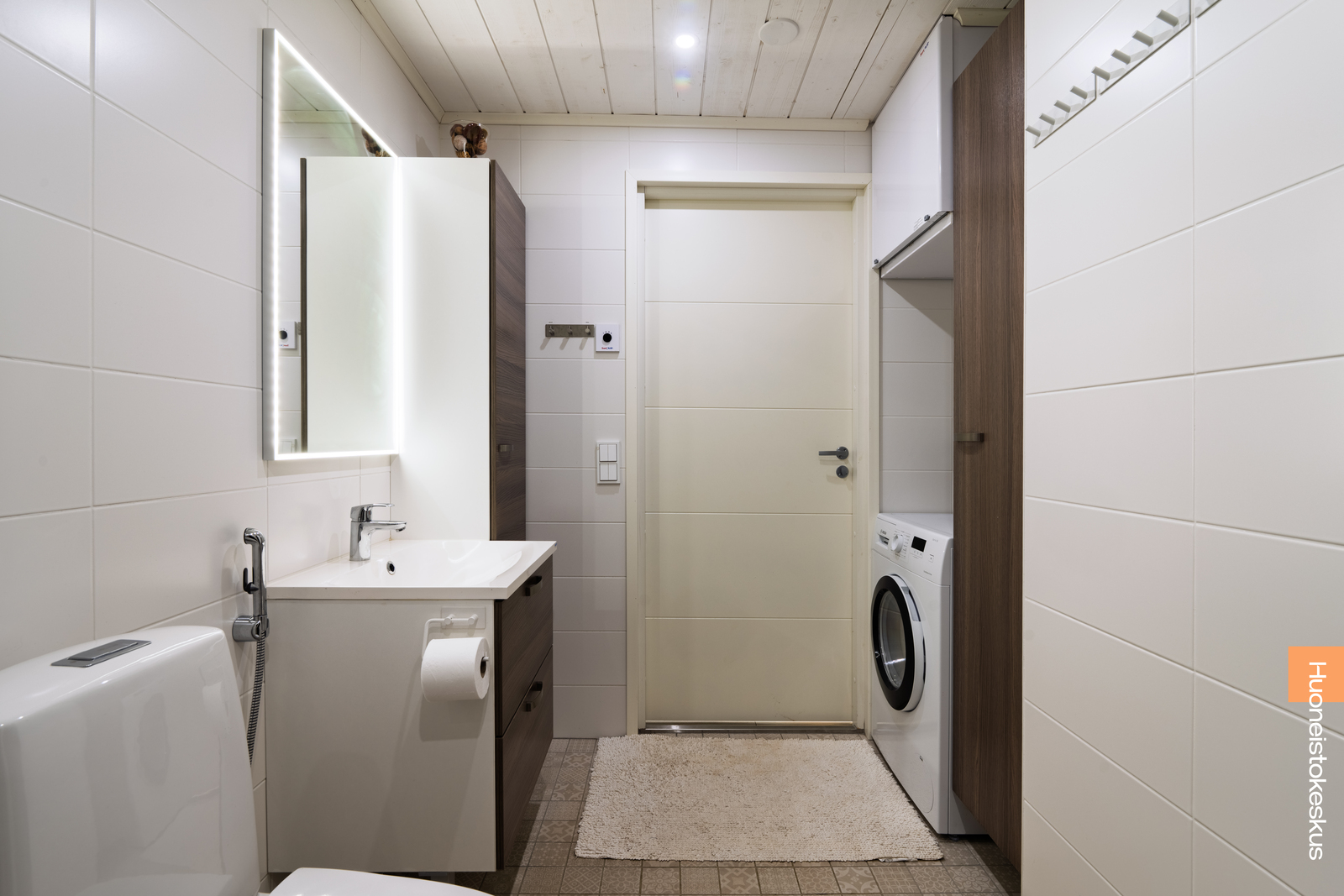 | Kylpyhuoneen kuvaus | WC-istuin, lattialämmitys, peili, suihkuseinä, pesukone ja suihku, seinät (kaakeli), lattiat (laatta) |