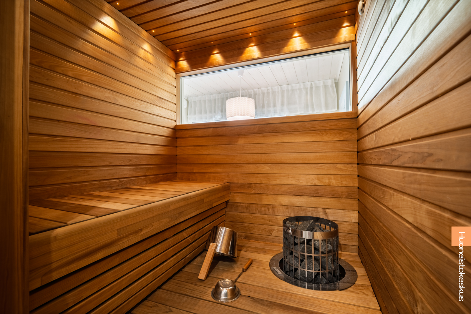 | Saunan kuvaus | Seinät (puu), lattiat (laatta), Sähkökiuas |