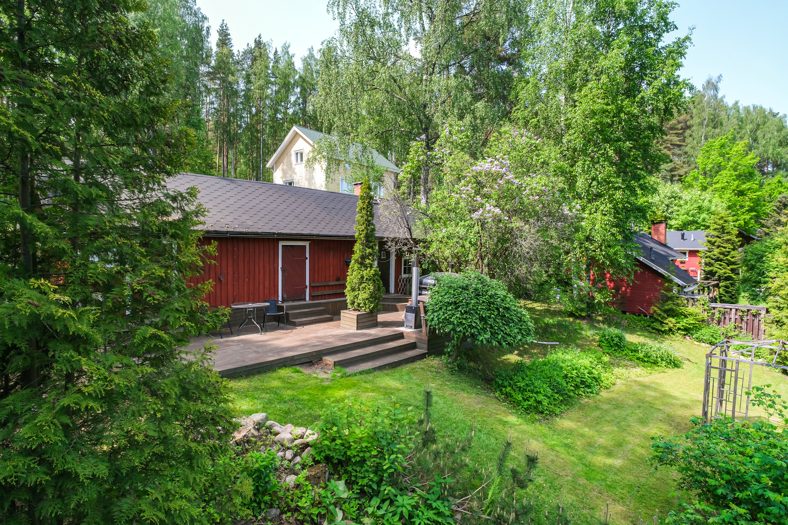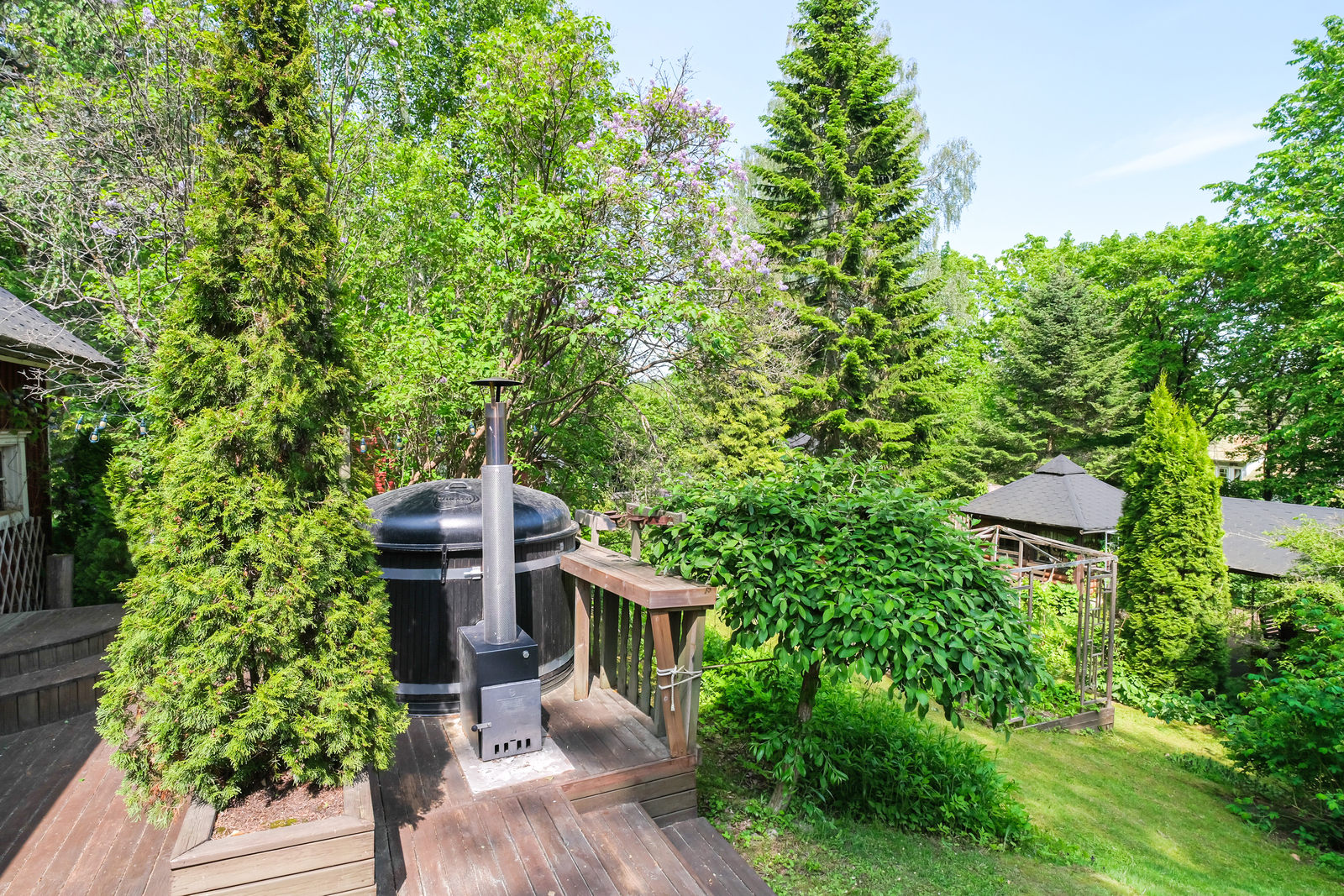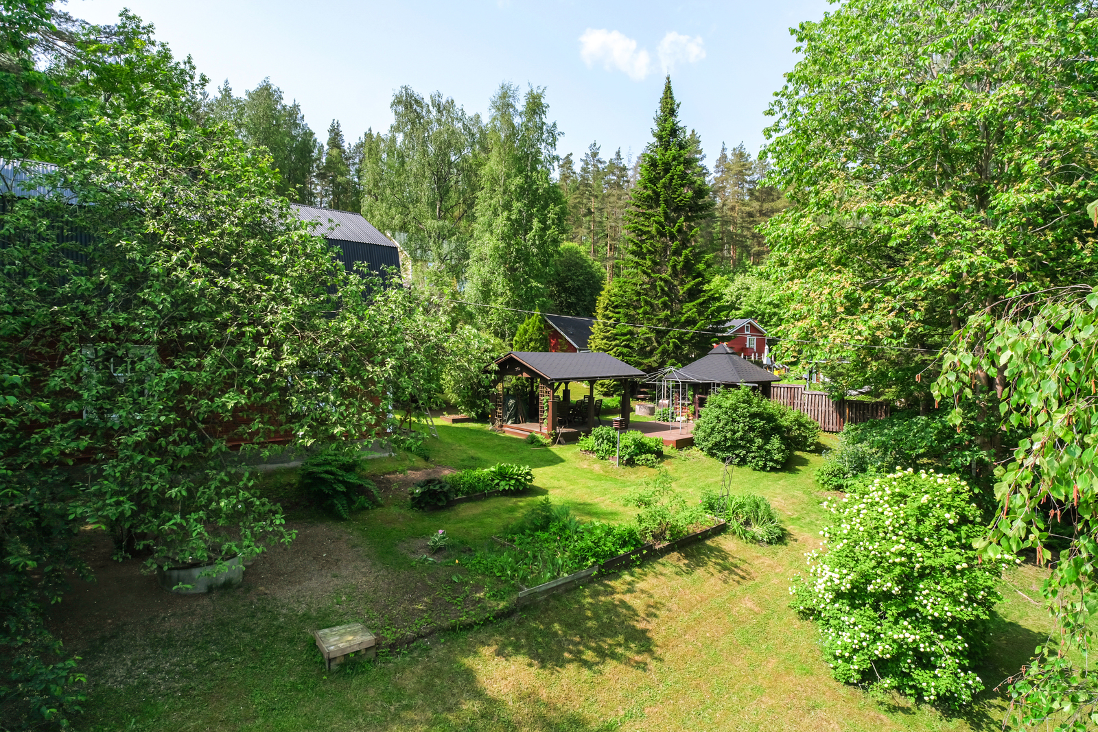 Ihastuttavan vehreässä pihassa kesähuone, perinteinen puusauna jonka edessä kylpytynnyri, katettu patio ja grillikatos. Kukkapenkkejä, marjapensaita yms.. Tähän ihastut varmasti.