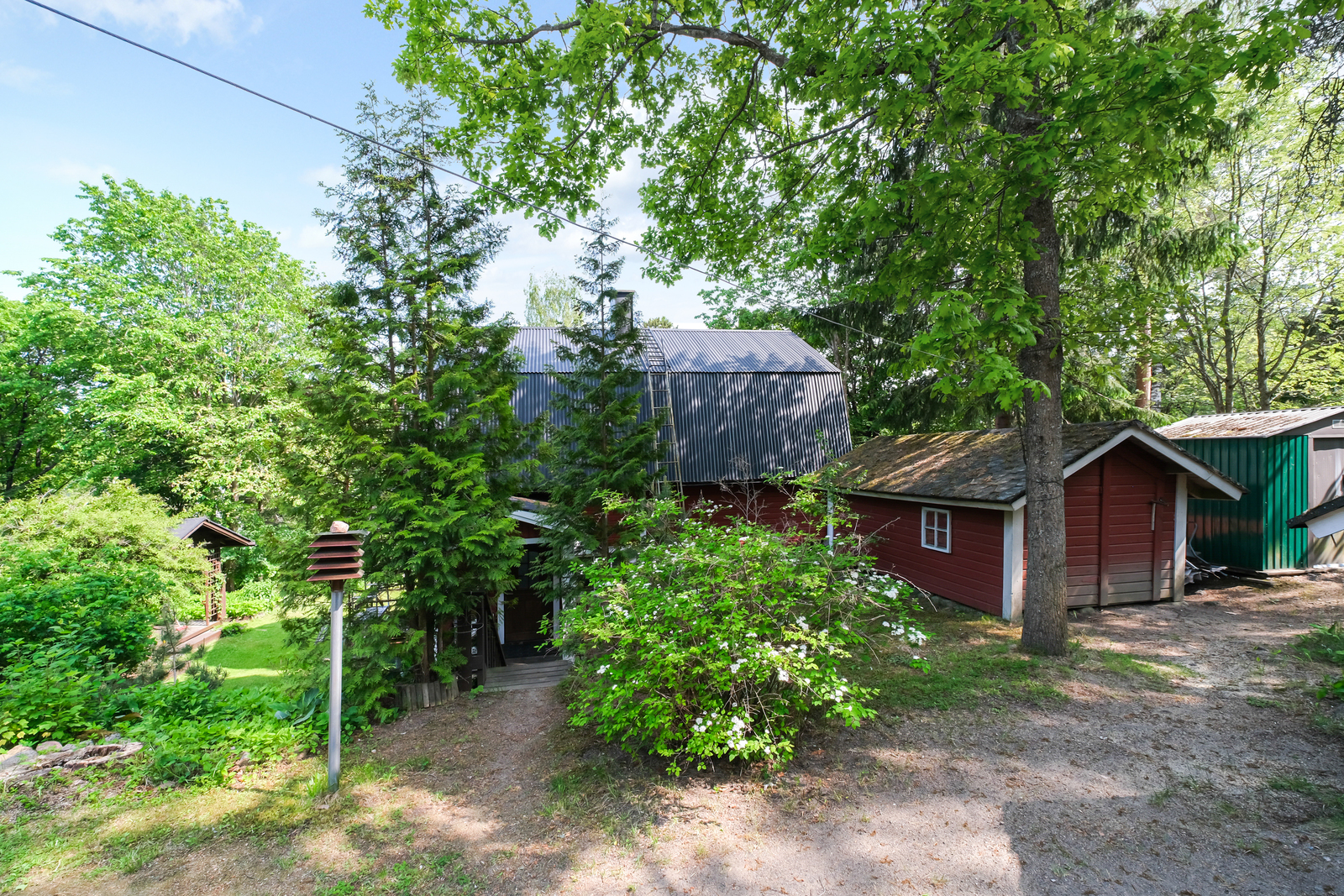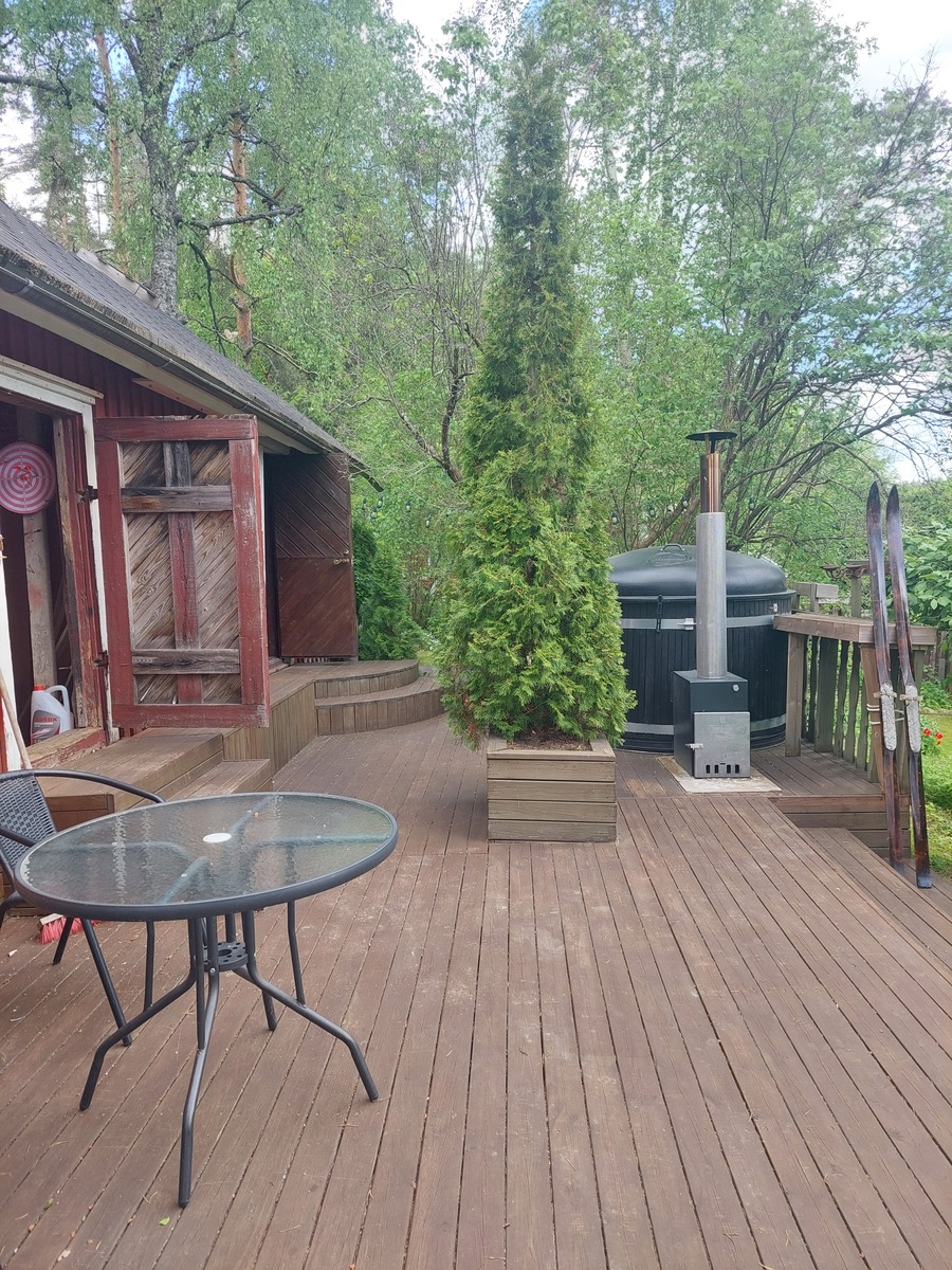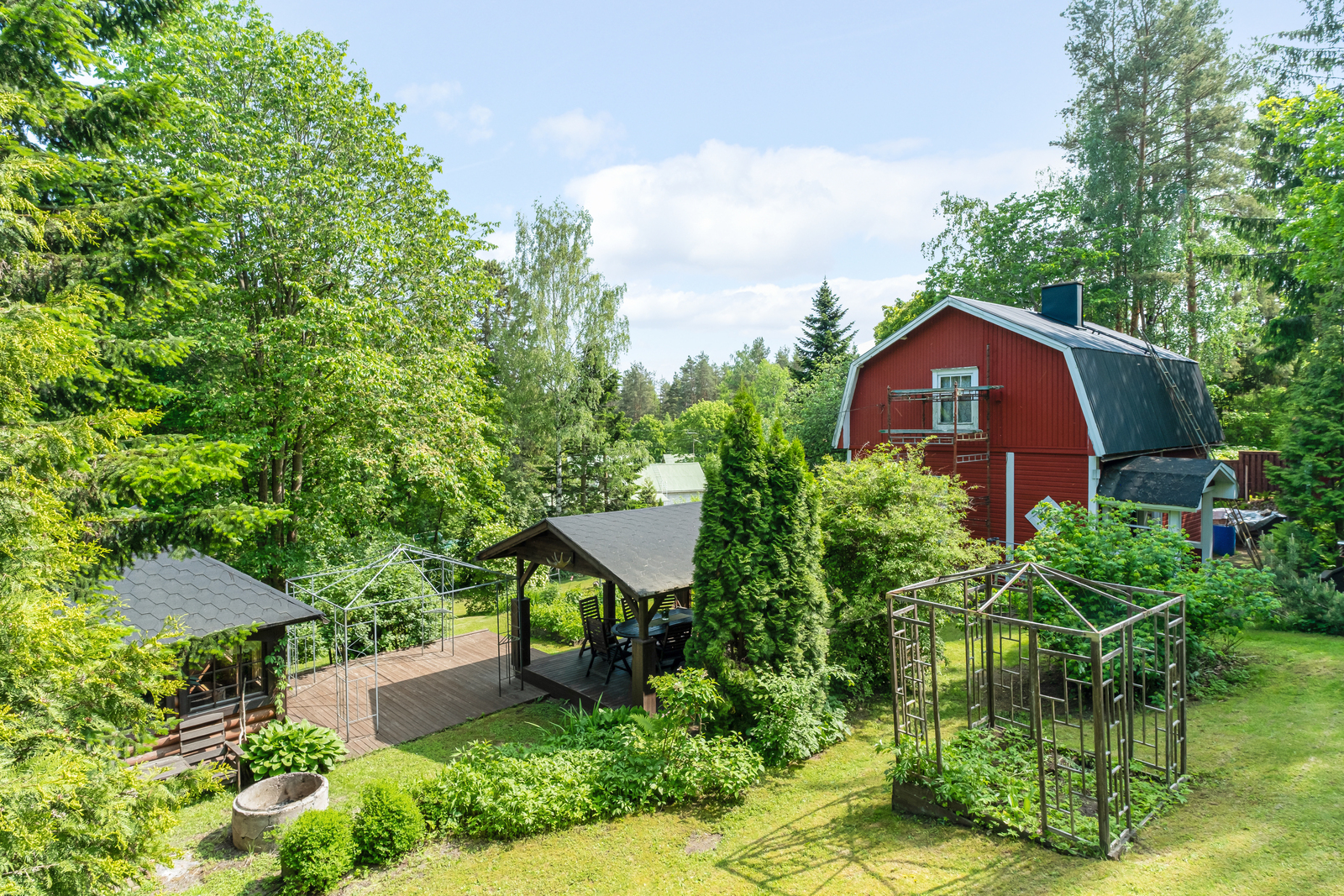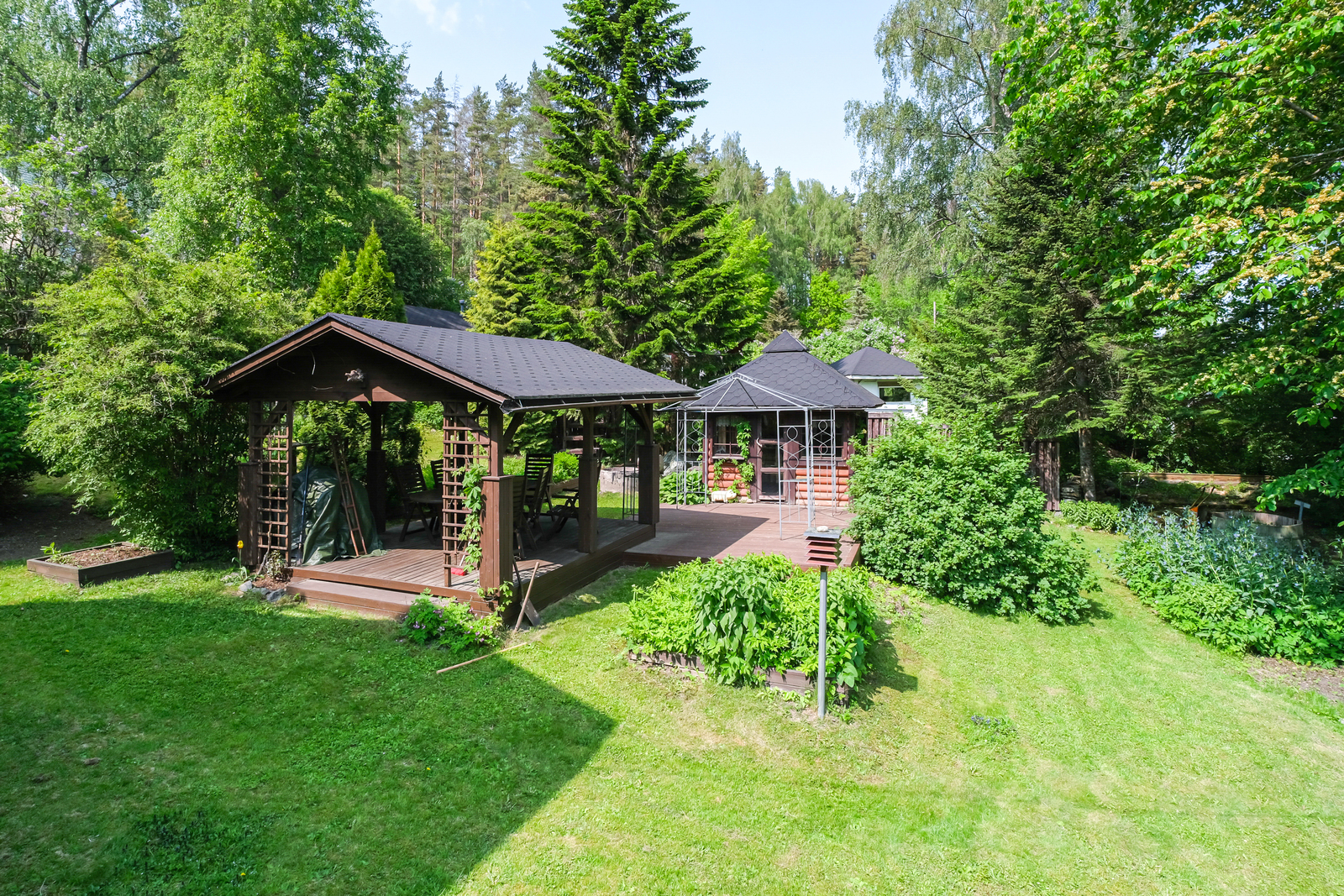Ihastuttavan vehreässä pihassa kesähuone, perinteinen puusauna jonka edessä kylpytynnyri, katettu patio ja grillikatos. Kukkapenkkejä, marjapensaita yms.. Tähän ihastut varmasti.