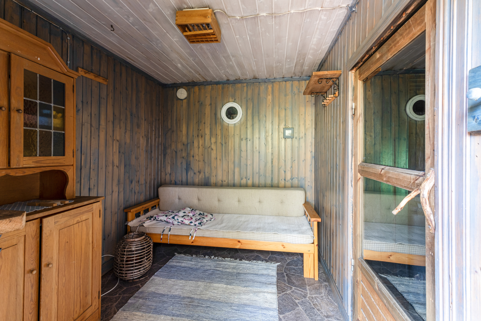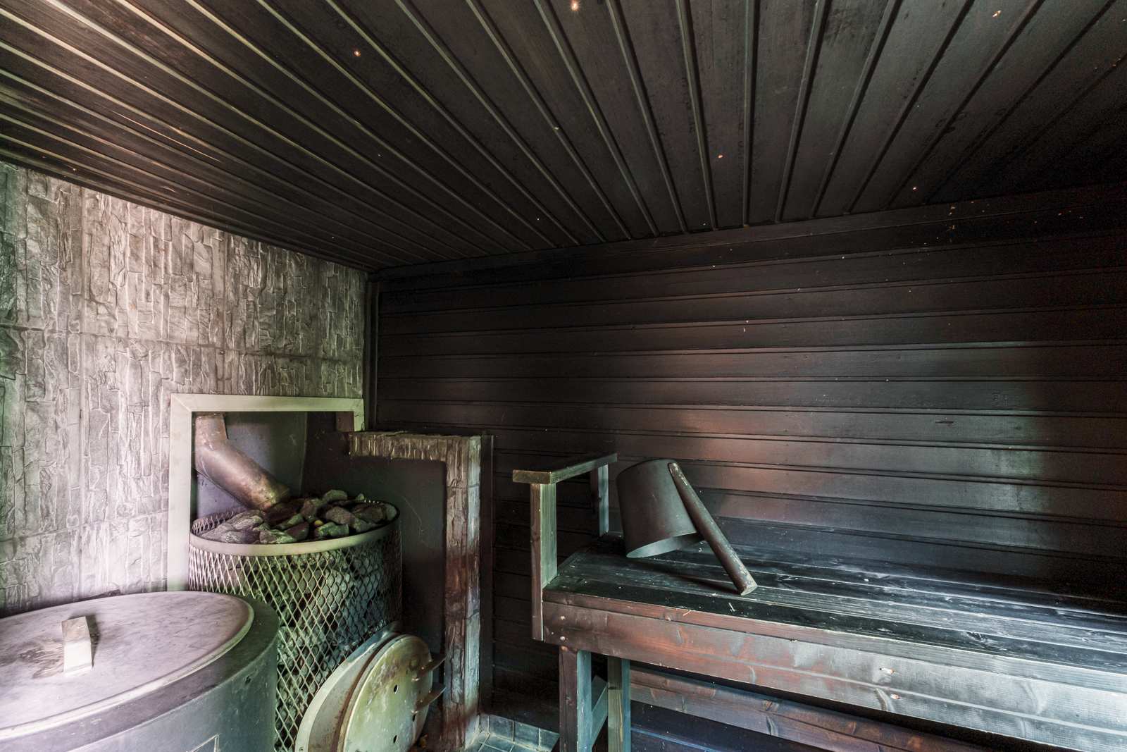 Seinät (puu), lattiat (laatta), Puukiuas, saunassa pata |