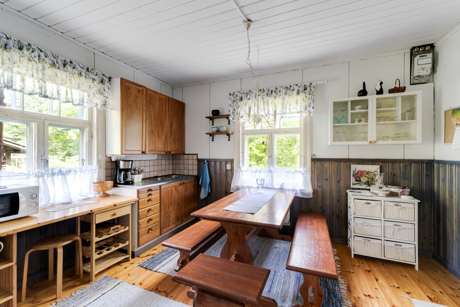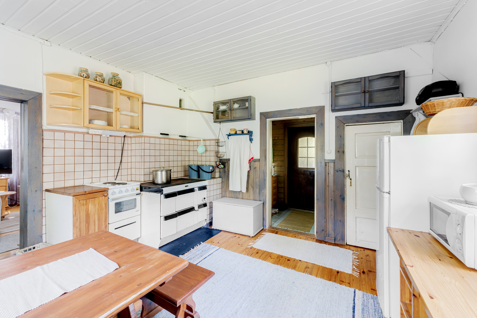 Liesi (sähköliesi, puuliesi), lattiat (lauta), mikroaaltouuni, jenkkikaappi ja liesi |