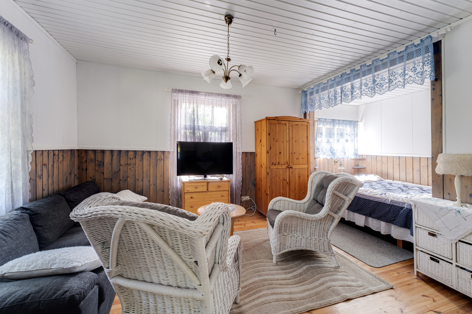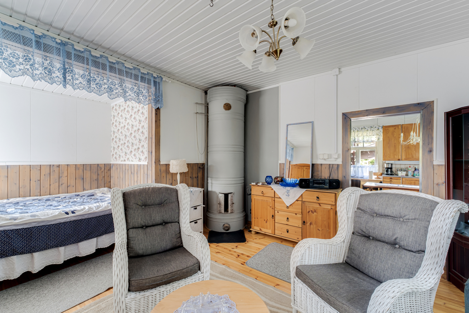 Seinät (tapetti), lattiat (lauta), olohuoneessa pystyuuni |